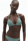 Треугольный бикини на подкладке, без проводов, с мягкими чашечками для увеличения бюста и декольте. Завязки сзади и двойные завязки на шее.