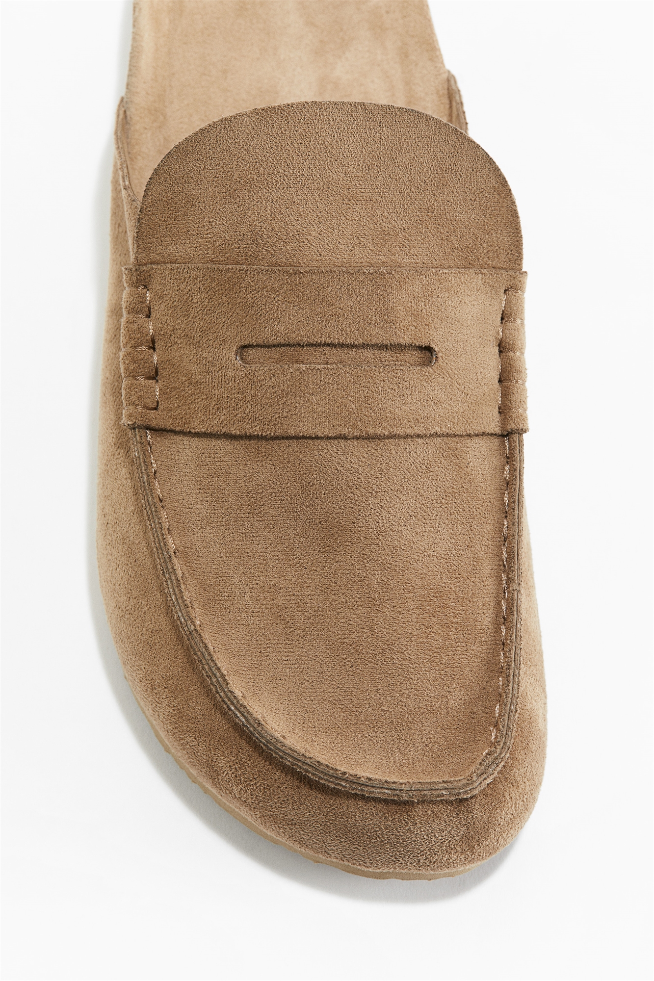 Мюли из тканого материала с мягкой ворсистой отделкой, закругленными носками, открытой пяткой, швом "мокасин" и прорезью "пенни". Подошва с узором.