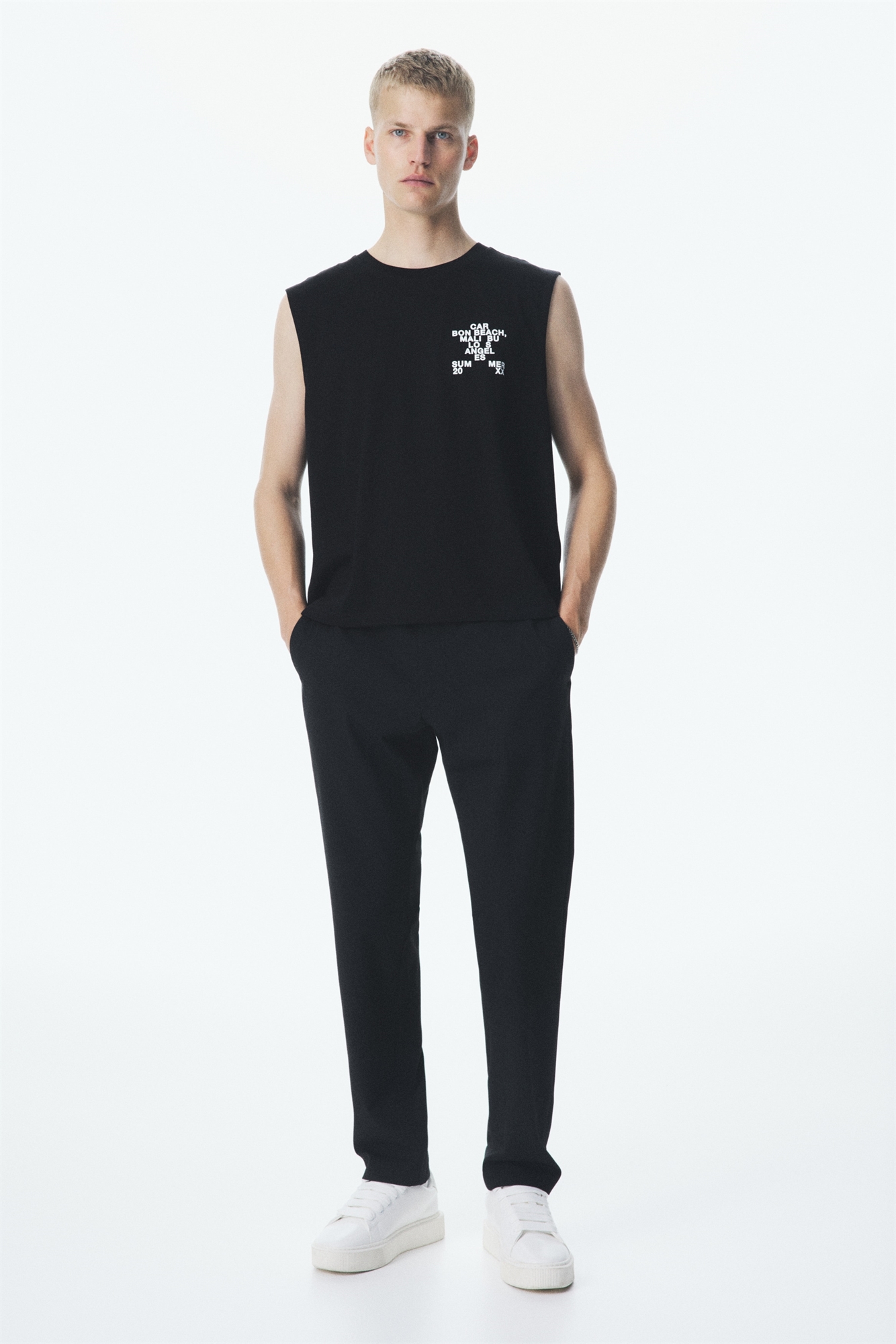 Брюки из тканого материала с ширинкой на молнии и пуговице, боковыми карманами и накладным задним карманом. Зауженный крой, облегающий контуры тела и создающий приталенный силуэт.