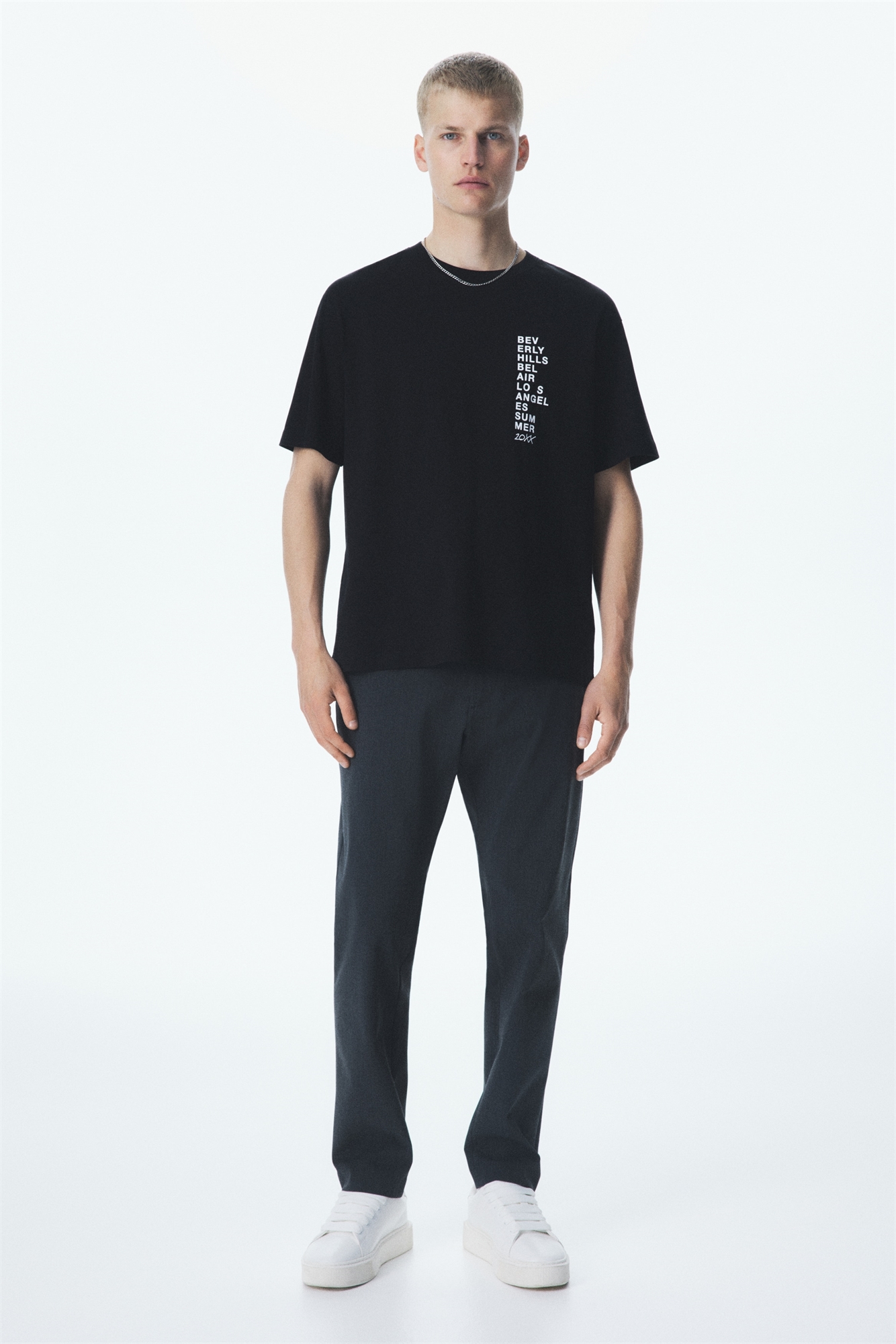 Брюки из тканого материала с ширинкой на молнии и пуговице, боковыми карманами и накладным задним карманом. Зауженный крой, облегающий контуры тела и создающий приталенный силуэт.