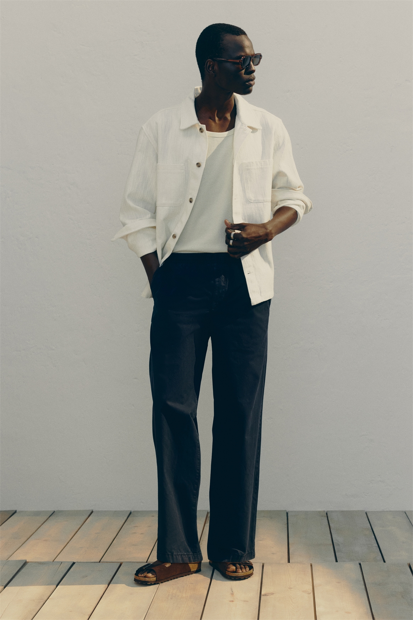 Брюки из хлопкового поплина с эластичной отделкой и скрытым шнурком на талии, фальшивой ширинкой, диагональными боковыми карманами и задними карманами. Свободный крой для непринужденного, но не чрезмерного силуэта.