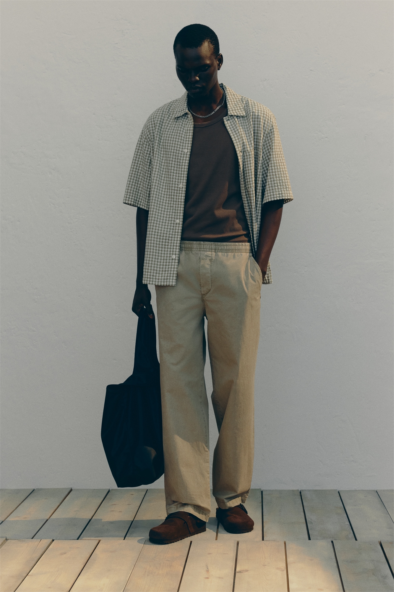 Брюки из хлопкового поплина с эластичной отделкой и скрытым шнурком на талии, фальшивой ширинкой, диагональными боковыми карманами и задними карманами. Свободный крой для непринужденного, но не чрезмерного силуэта.