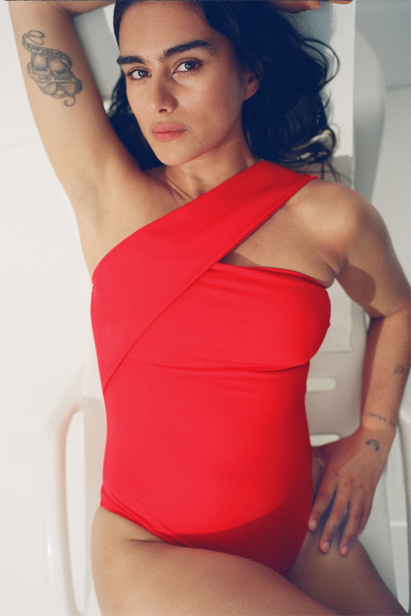 Полностью закрытый купальник на одно плечо с широкой диагональной бретелью и мягкими чашечками, придающими форму бюсту и обеспечивающими хорошую поддержку. Вырез на спине.