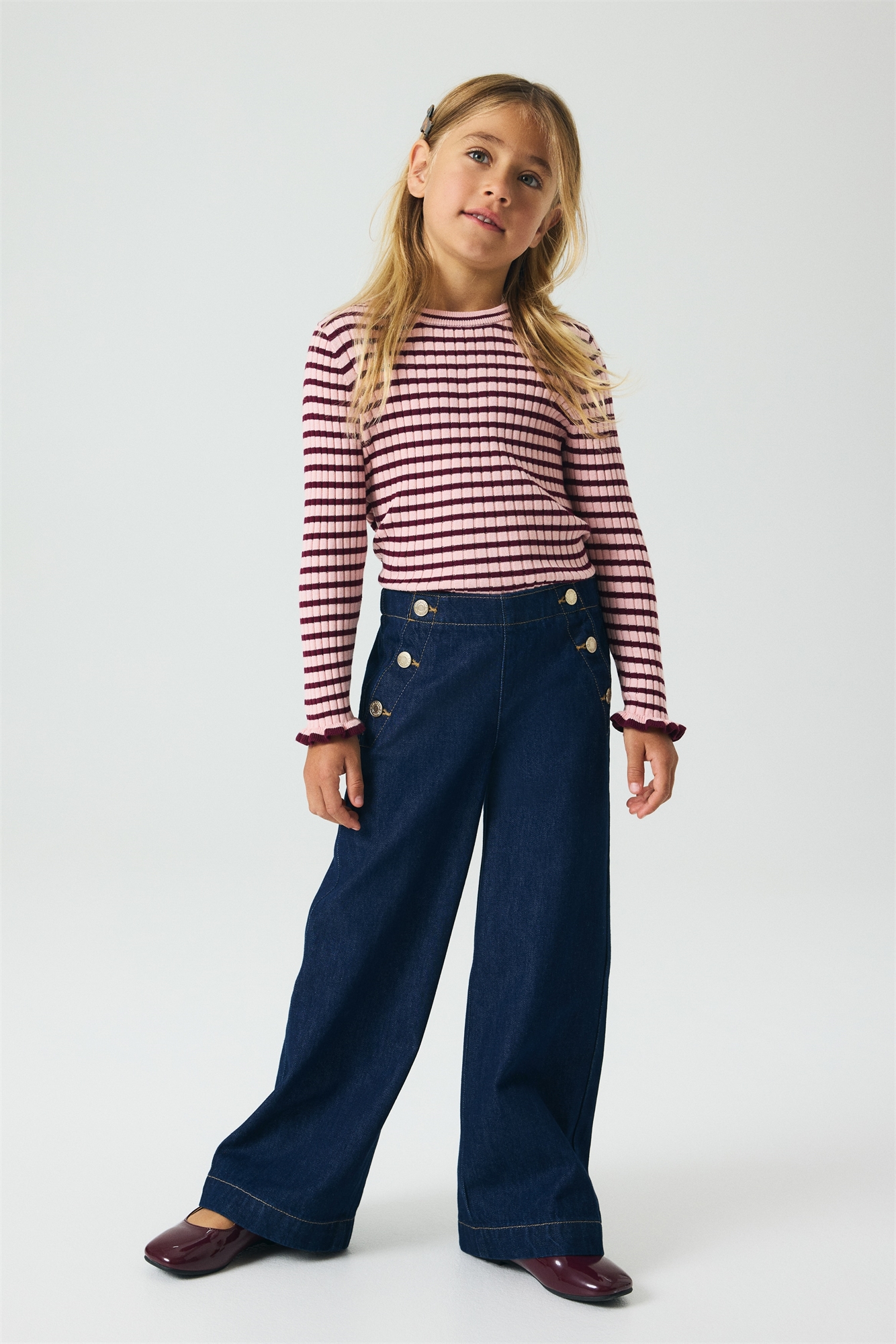 Джинсы в матросском стиле из мягкого хлопкового денима с декоративными диагональными боковыми карманами с застежкой на кнопки. Свободный крой по бедрам и ляжкам, регулируемая резинка на талии и широкие штанины.