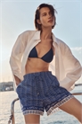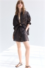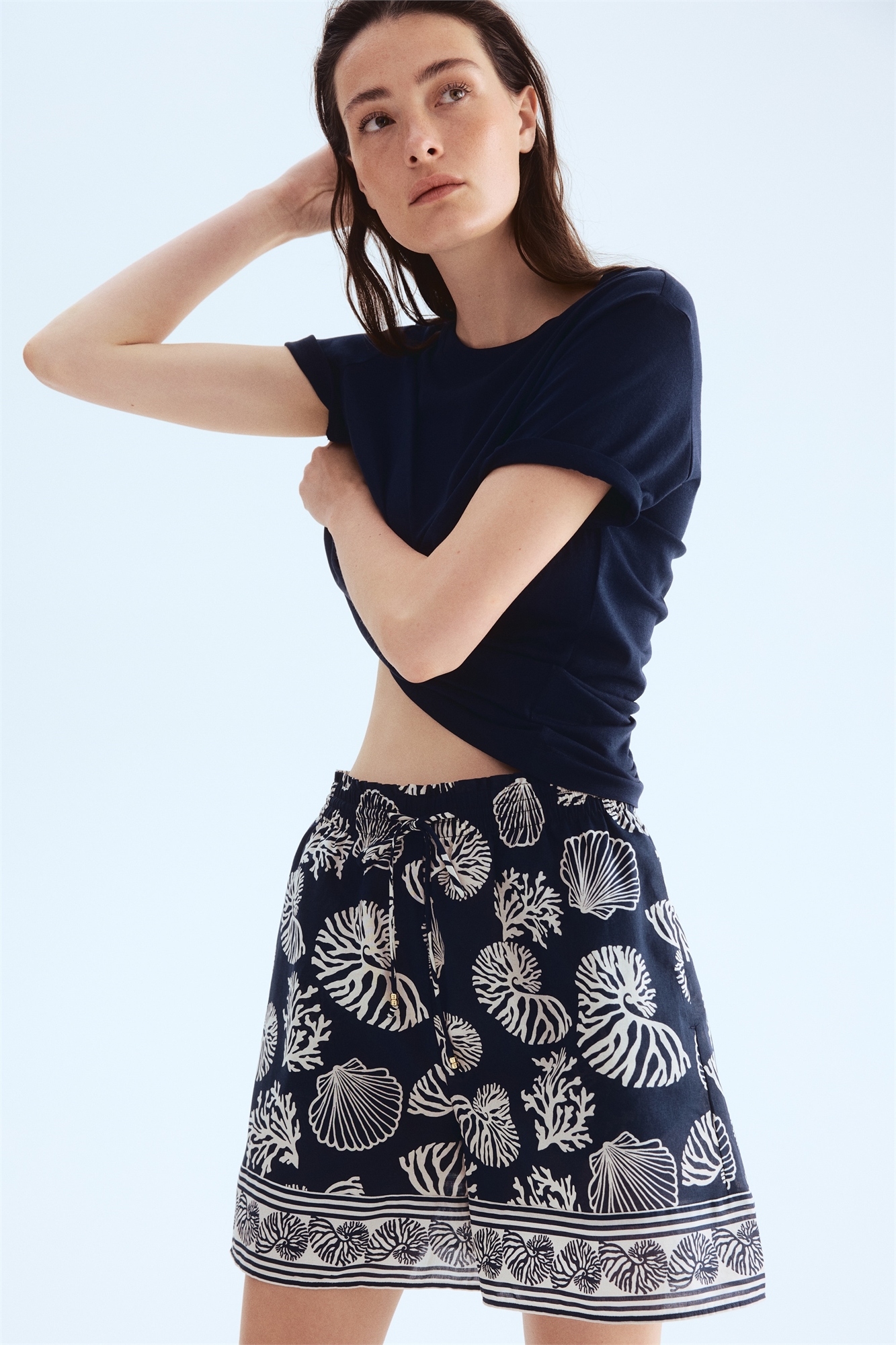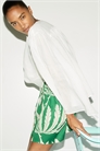 Свободные шорты из мягкого хлопка с набивным рисунком. Высокая талия с эластичным поясом и утягивающим шнурком, украшенным металлическими бусинами. Сборки в верхней части и незаметные боковые карманы.