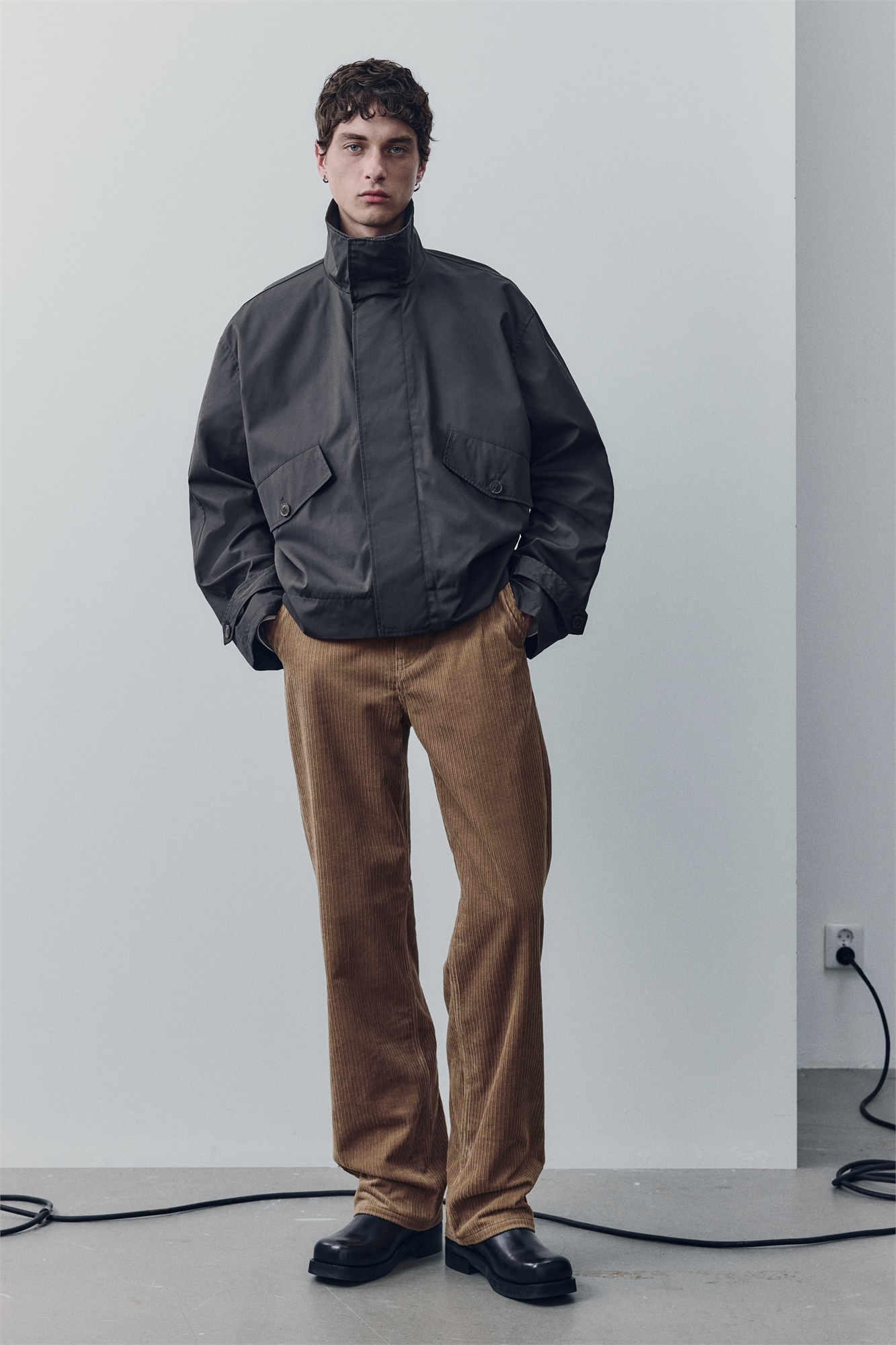 Короткая куртка из смеси хлопка и нейлона с воронкообразным воротником, застежкой-молнией и ветрозащитным клапаном с потайными кнопками спереди, длинными рукавами и регулируемой планкой с двумя кнопками на манжетах. Модель имеет свободный крой, передние карманы с клапаном на пуговице и два внутренних кармана. Сзади подол отделан эластичным материалом. Мягкая подкладка.