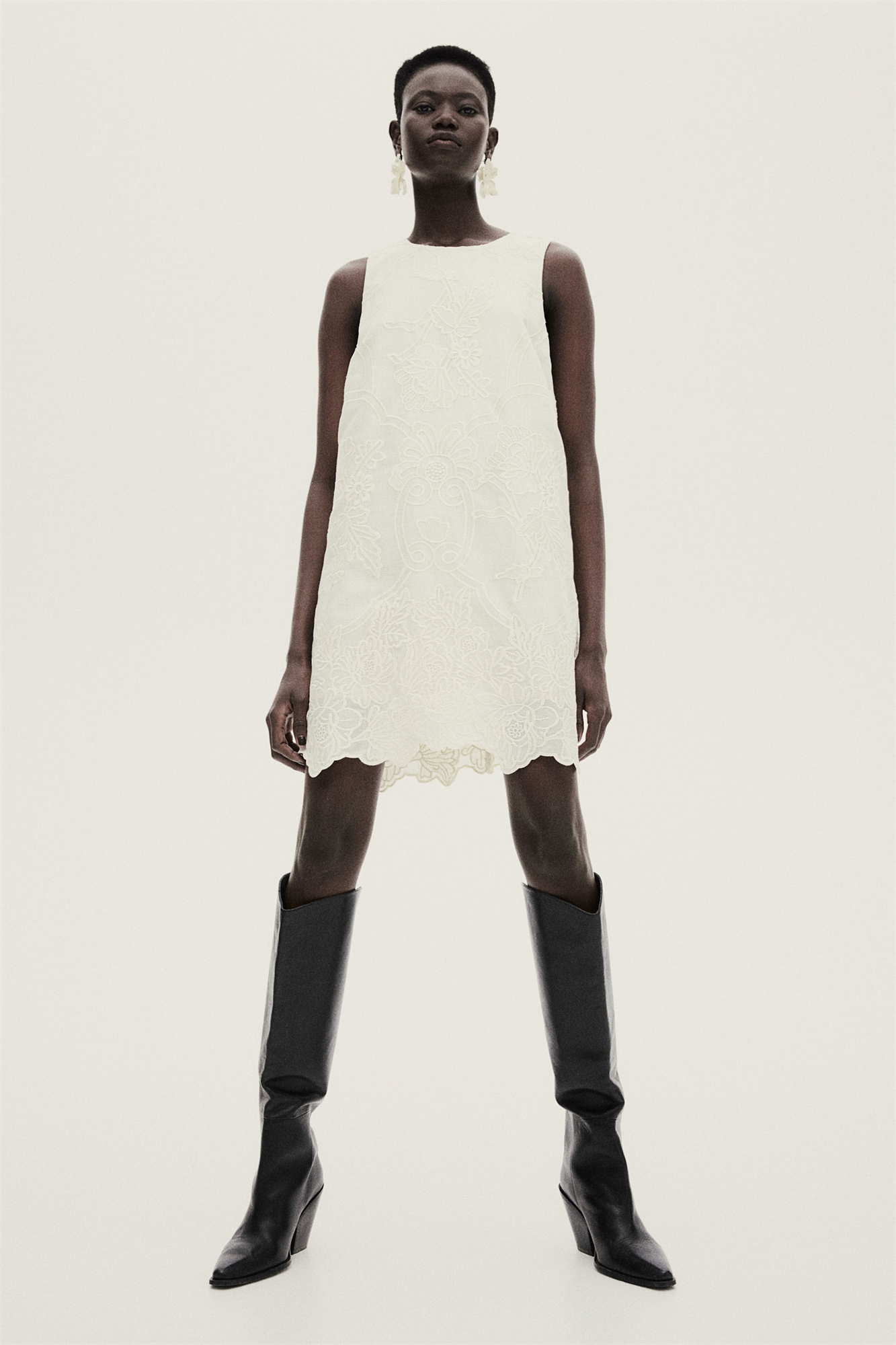 Короткое платье без рукавов из тканого материала с вышивкой тон в тон. Круглый вырез и силуэт А-линии с гребешковым подолом, повторяющим вышитый рисунок. Скрытая застежка-молния и застежка-крючок сзади. Подкладка из хлопковой вуали.