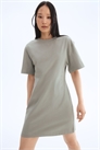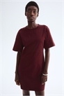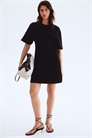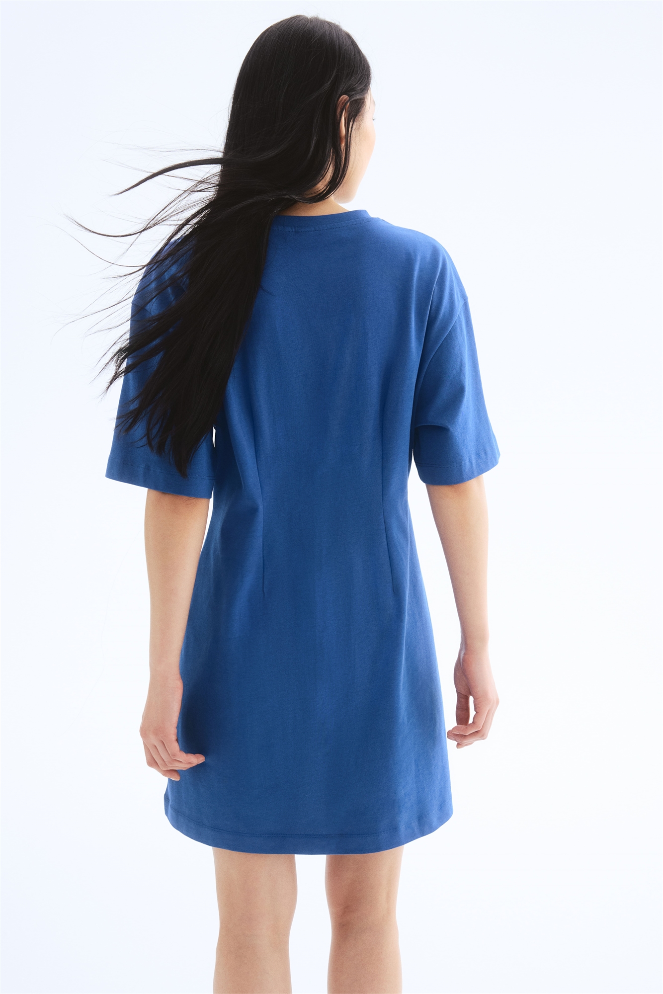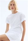 Короткое платье из мягкого хлопкового джерси с круглым вырезом с ребристой отделкой, спущенными плечами и рукавами, заканчивающимися чуть выше локтей. Формирующие вытачки на талии сзади придают силуэту облегающий вид.