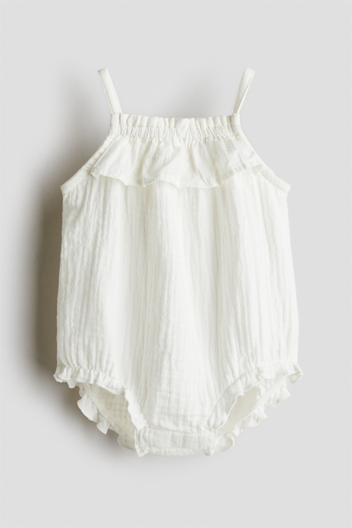 Костюм-ромпер без рукавов из мягкого хлопкового муслина с декоративным воланом с бродери-англиз в верхней части. Квадратный, эластичный вырез с небольшой оборкой и узкие бретели. Скрытые кнопки внизу для удобства переодевания и оборки по краям ножек.