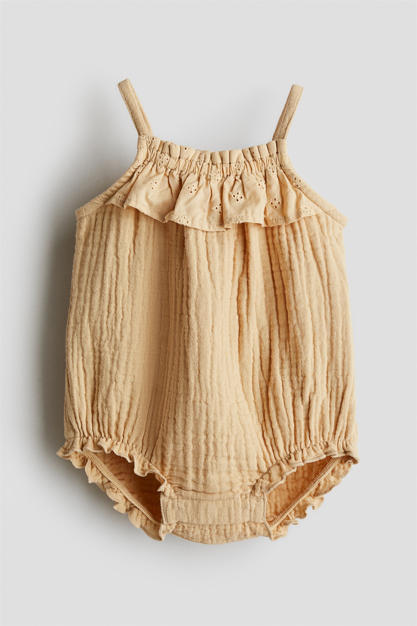 Костюм-ромпер без рукавов из мягкого хлопкового муслина с декоративным воланом с бродери-англиз в верхней части. Квадратный, эластичный вырез с небольшой оборкой и узкие бретели. Скрытые кнопки внизу для удобства переодевания и оборки по краям ножек.