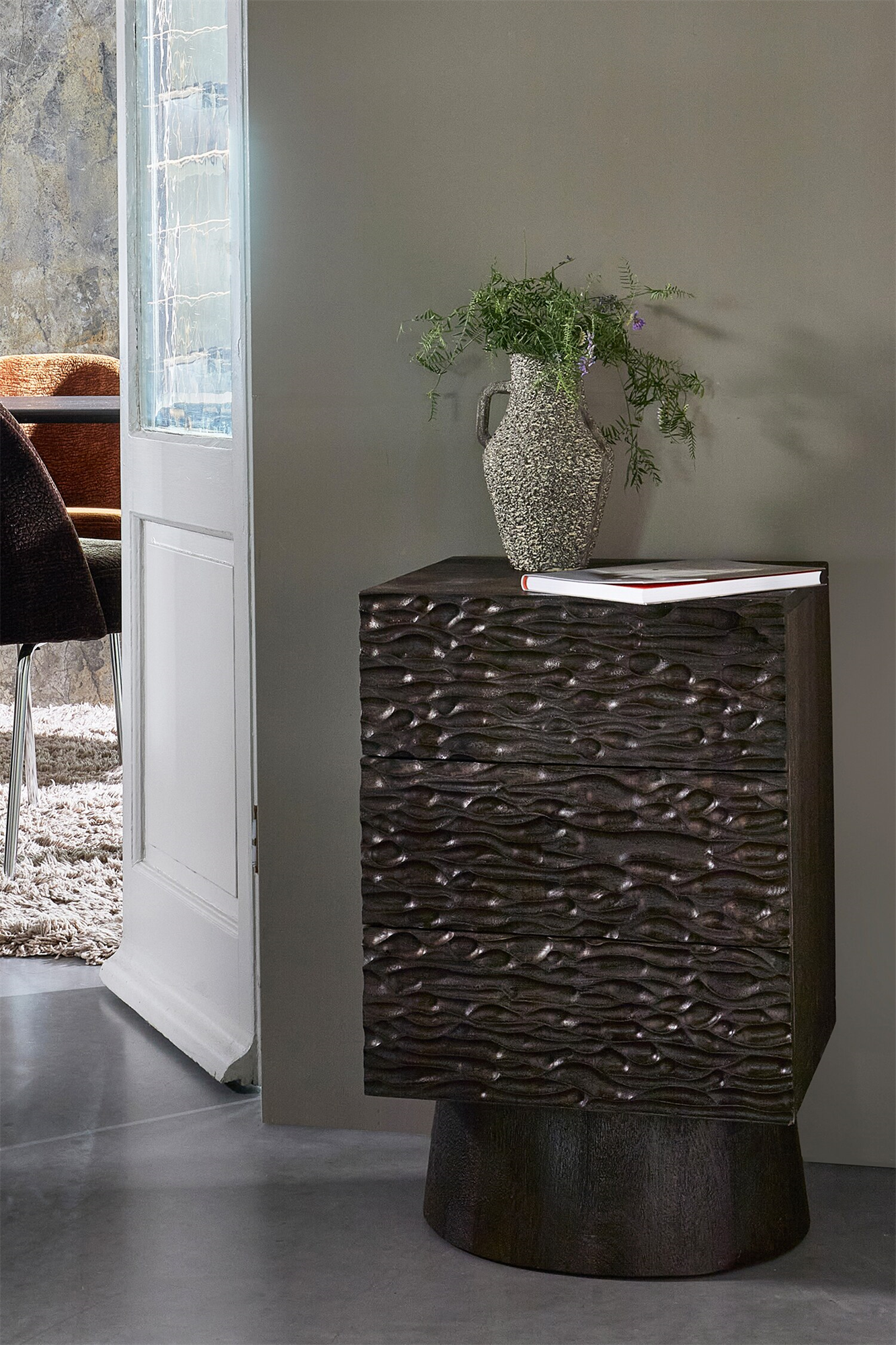 Прикроватная тумбочка Crumble от WOOOD сочетает в себе игривую структуру, широкие ножки и теплый вид. Изготовленная из экологически чистой древесины манго, она впечатляет своим золотисто-коричневым цветом и уникальной текстурой. Прикроватная тумбочка предлагает много места благодаря трем выдвижным ящикам и имеет высоту 63,5 см, ширину 40 см и глубину 37 см. Высота прочных ножек составляет 16 см. Древесину манго легко чистить влажной тряпкой. Для мебели высотой более 50 см рекомендуется использовать защиту от опрокидывания. Предмет мебели поставляется в упаковке с войлочными полозьями для защиты пола.