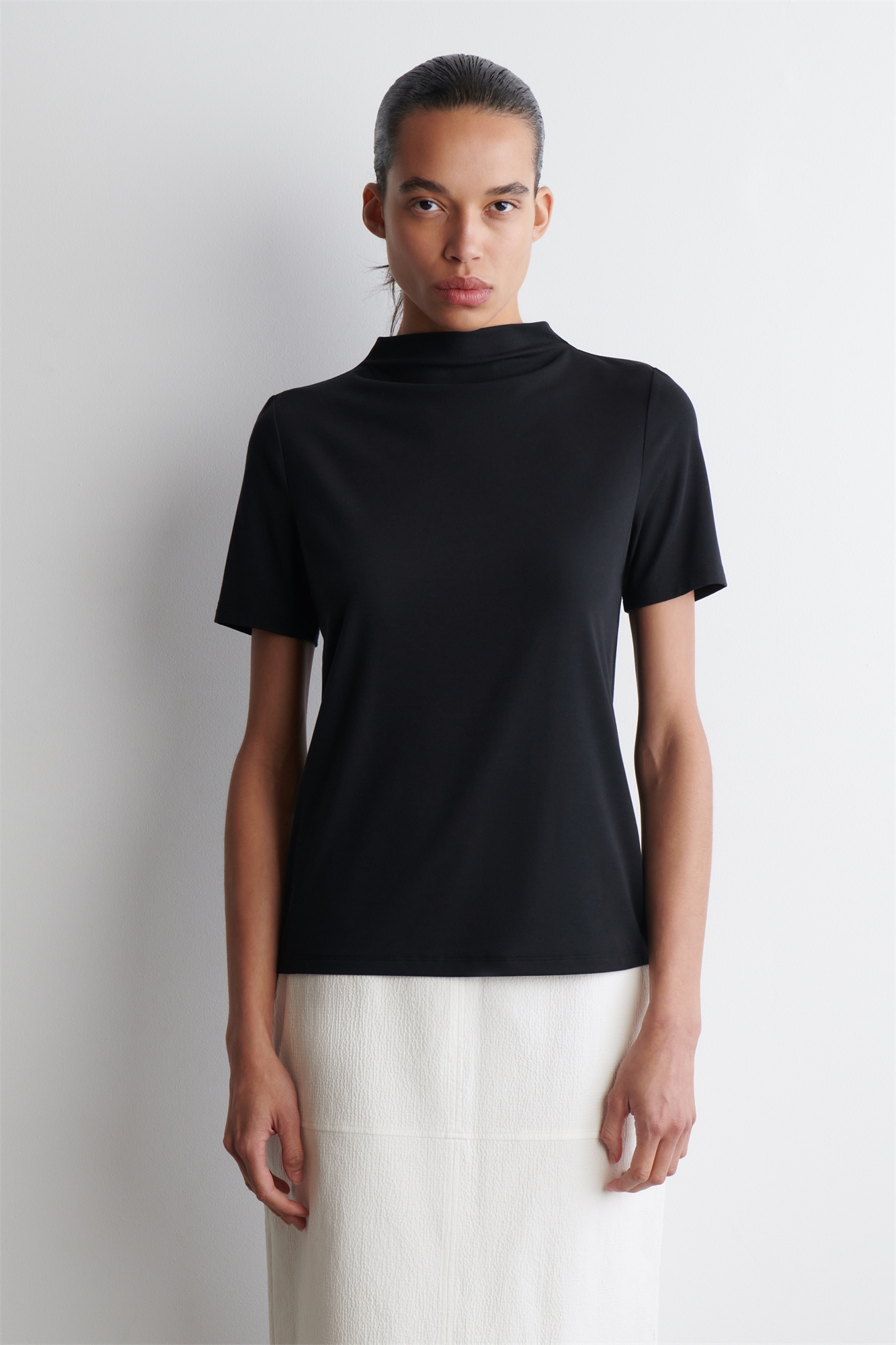 Эта модель, представляющая собой тонкое переосмысление классической футболки, имеет облегающий силуэт с мягко драпированным высоким вырезом. Она изготовлена из модального трикотажа, выбранного за его мягкость и подвижность, и выполнена в стойком черном цвете, который без труда составит пару с остальным вашим гардеробом. Зауженный крой Материал: 89% модал, 11% эластан. Без учета отделки / Машинная стирка Длина по спинке для размера S составляет 63 см / Модель носит размер S
