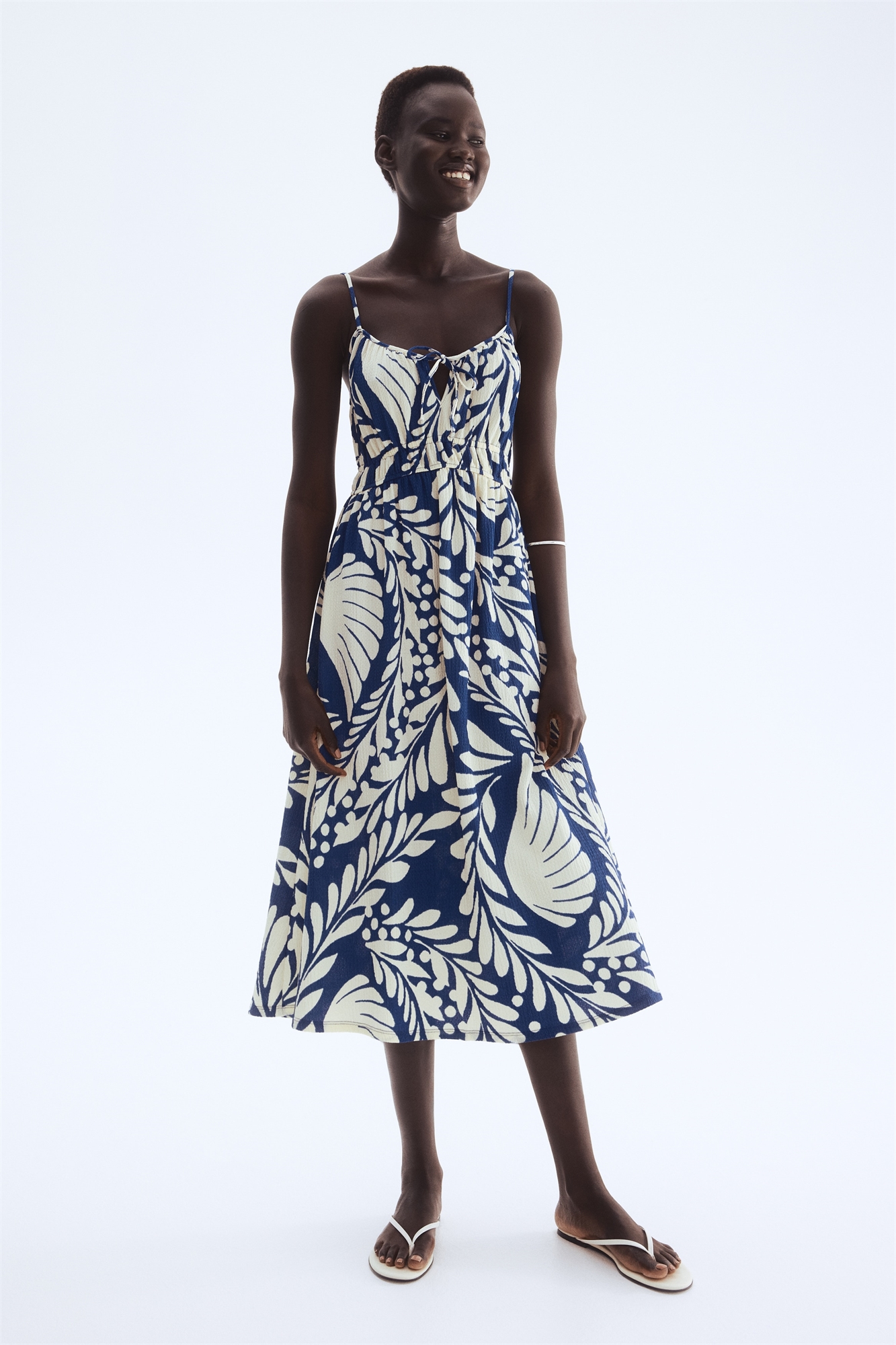 Платье длиной до колена из махрового джерси с регулируемыми бретелями-спагетти и вырезом в форме сердца с замочной скважиной и узкими завязками по центру бюста. Узкая эластичная резинка под бюстом и мягко расклешенная юбка.