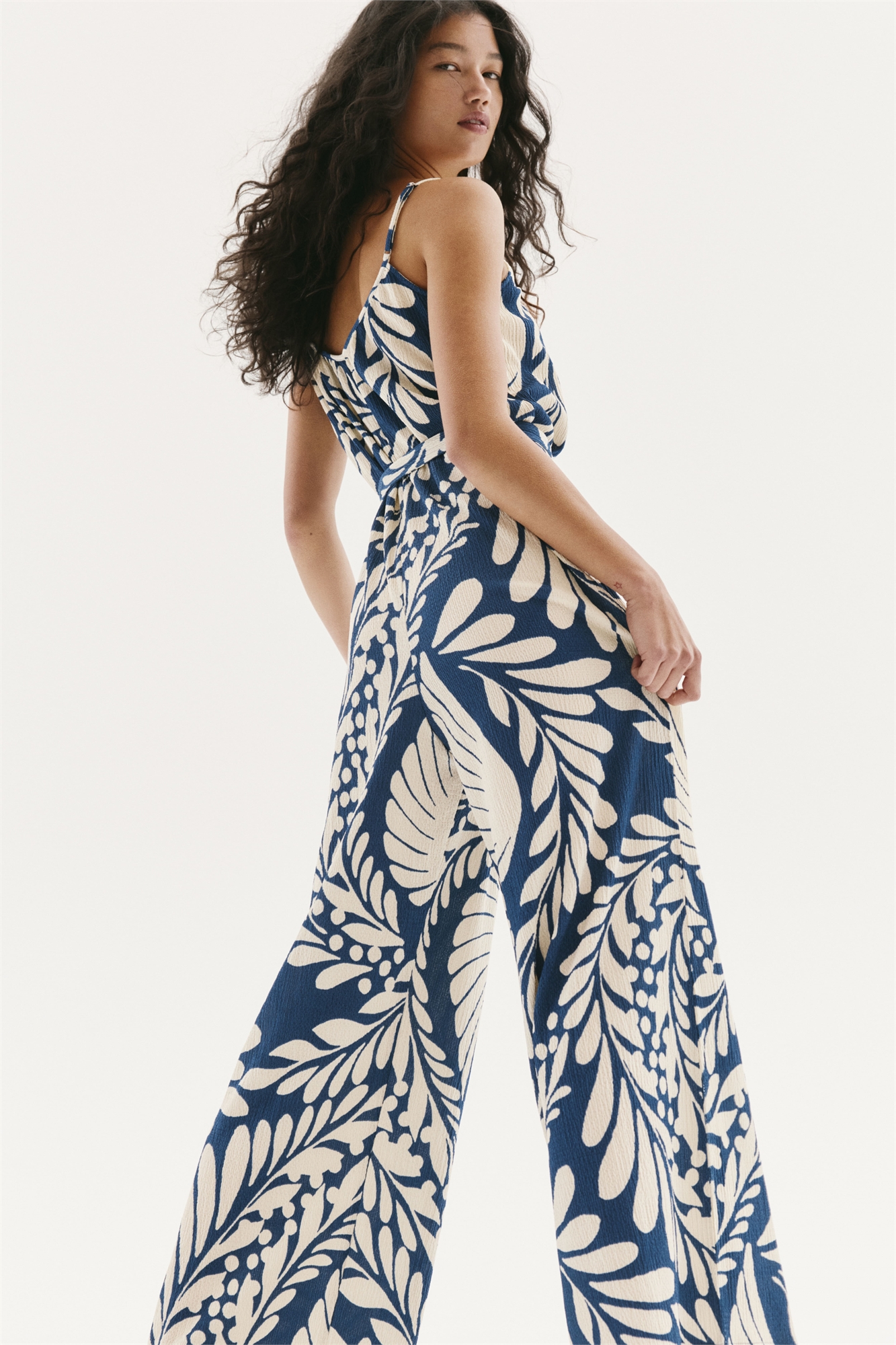 Джемпер из мятого джерси с узкими регулируемыми бретелями и V-образным вырезом с завязками спереди и сзади. Широкий съемный пояс на талии и прямые ноги.