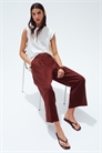 Приталенные брюки длиной до щиколоток из льна и вискозы с высокой талией и ширинкой на молнии с потайной застежкой на крючок и планку. Свободный крой с диагональными боковыми карманами, фальшивым накладным карманом сзади и широкими ногами со складками спереди и складками спереди и сзади.