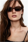 Прямоугольные солнцезащитные очки с пластиковой оправой и боковыми дужками. Тонированные пластиковые линзы с УФ-защитой.