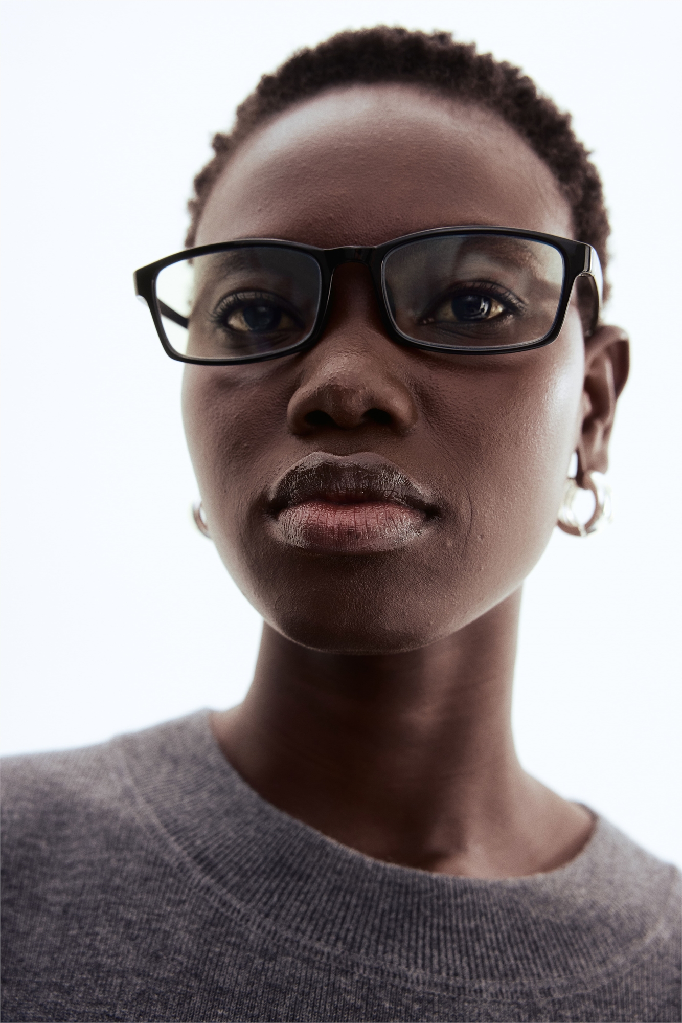 Прямоугольные очки с оправой и прозрачными линзами из пластика. Линзы имеют специальное покрытие, отсеивающее синий свет от цифровых экранов.