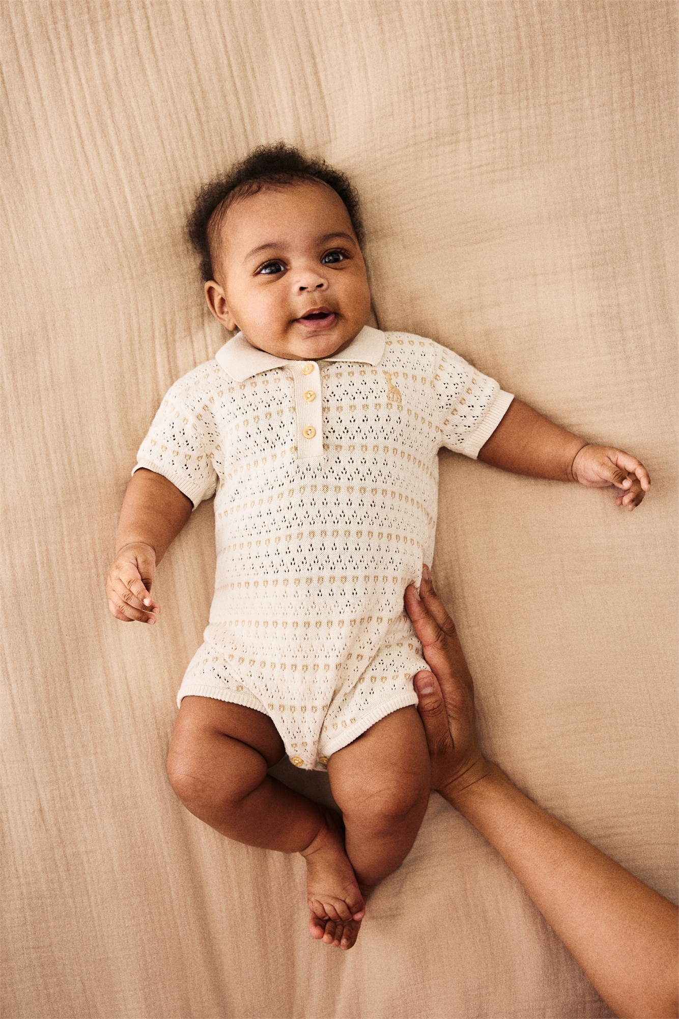 H&M x Sophie la girafe. Ромпер с короткими рукавами из мягкого хлопка с пуантельевой вязкой и маленькой вышитой деталью спереди. Отложной воротник, застежка на пуговицы и манжеты. Пуговицы внизу для удобства переодевания и узкая ребристая окантовка вокруг ножек.