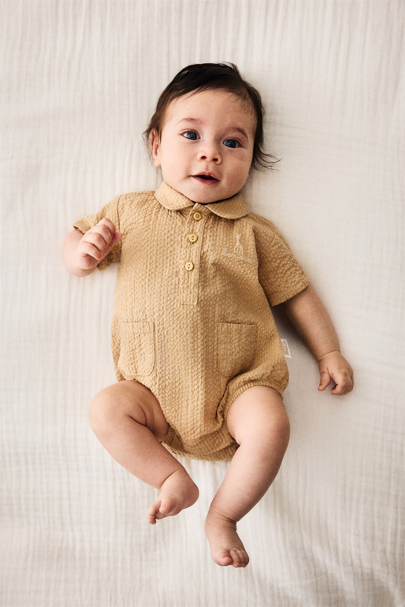H&M x Sophie la girafe. Ромпер из мягкого хлопка с небольшим вышитым рисунком спереди. Отложной воротник, застежка на пуговицах и короткие рукава. Накладные карманы спереди, мягкая узкая резинка вокруг ног и потайные кнопки внизу для удобства переодевания.