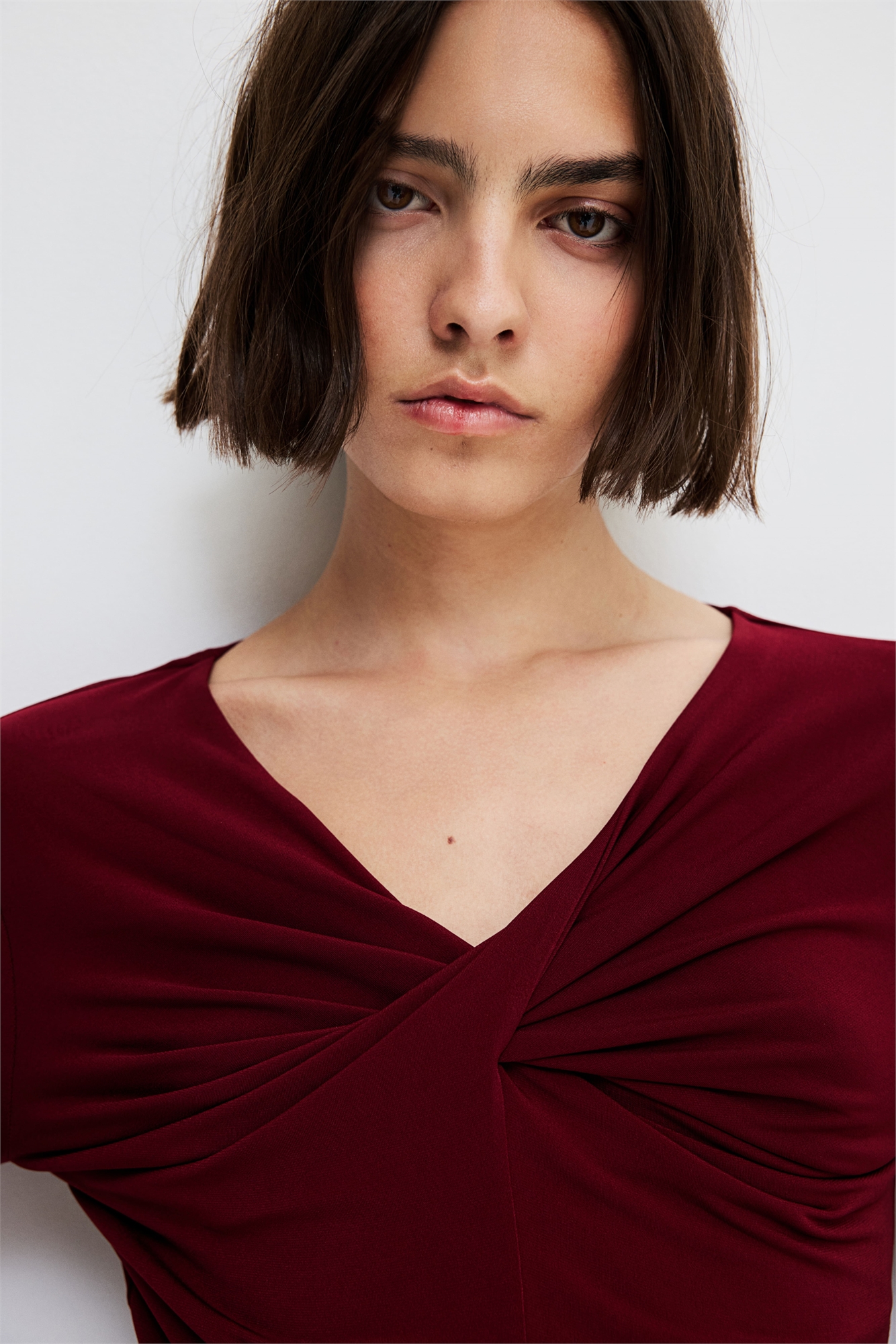 Облегающий топ с длинными рукавами из мягкого джерси-стрейч с V-образным вырезом и перекрученной деталью спереди, создающей эффект драпировки.