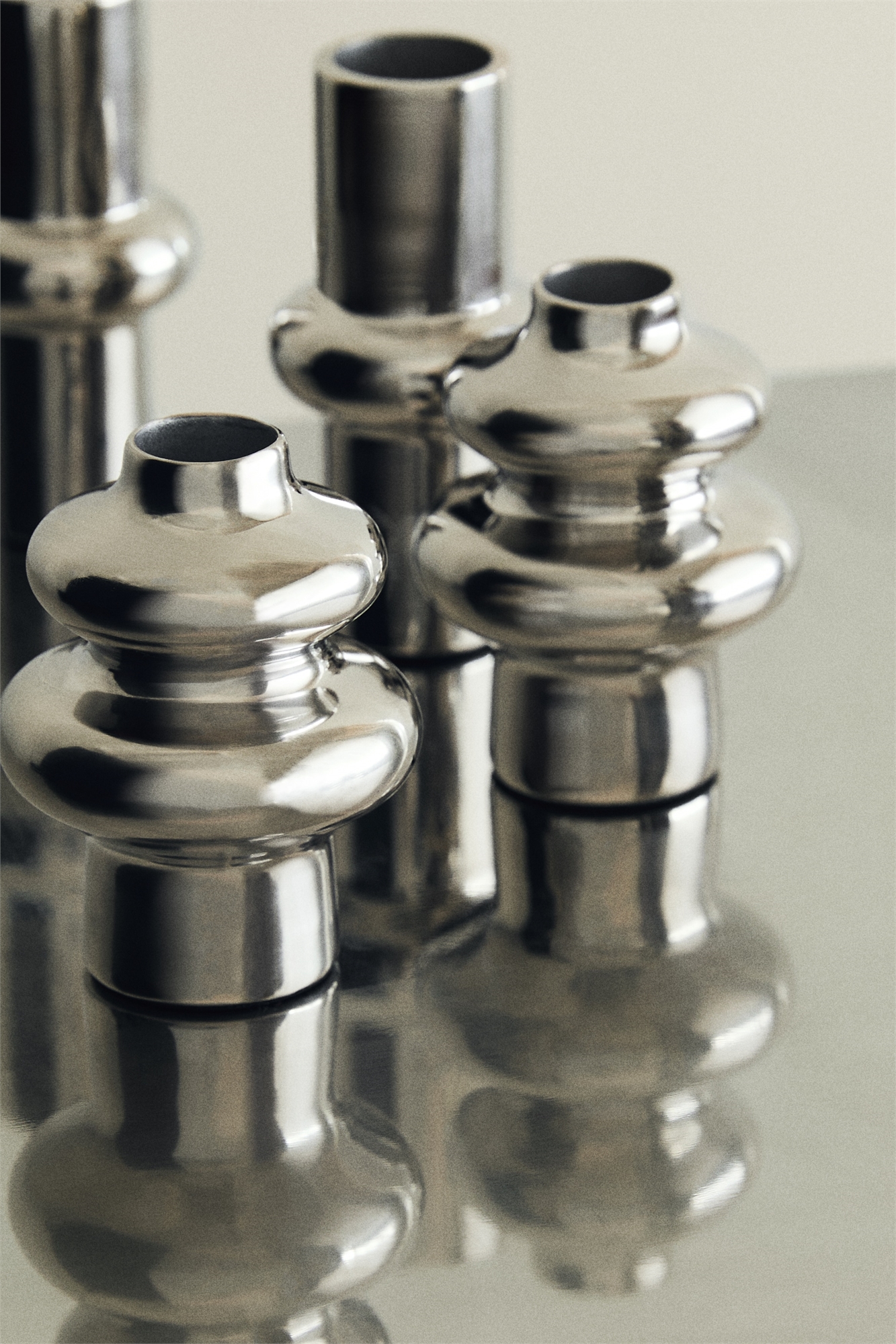 Набор из двух небольших ваз из металла с хромированной отделкой. Поставьте в эти маленькие вазы летние цветы или свежие веточки, чтобы придать им утонченный и элегантный вид. Размеры маленькой вазы: Диаметр 5,5 см. Высота 8 см. Размеры большой вазы: Диаметр 5,5 см. Высота 10 см.