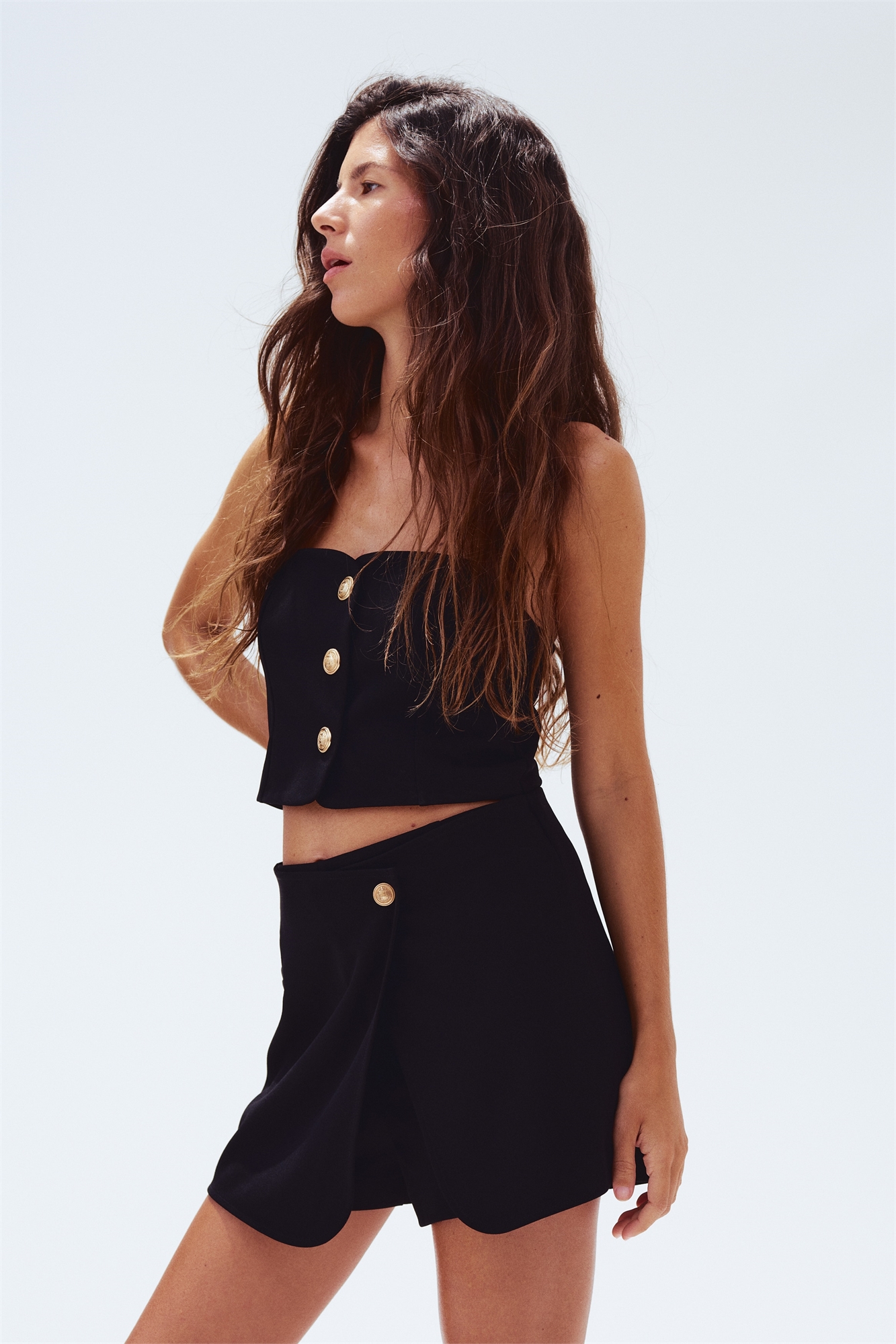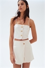 Короткие шорты из плотного трикотажа интерлок с заворачивающимся передом, металлической пуговицей и втачным карманом. Высокая талия с вытачками сзади и скрытой резинкой.
