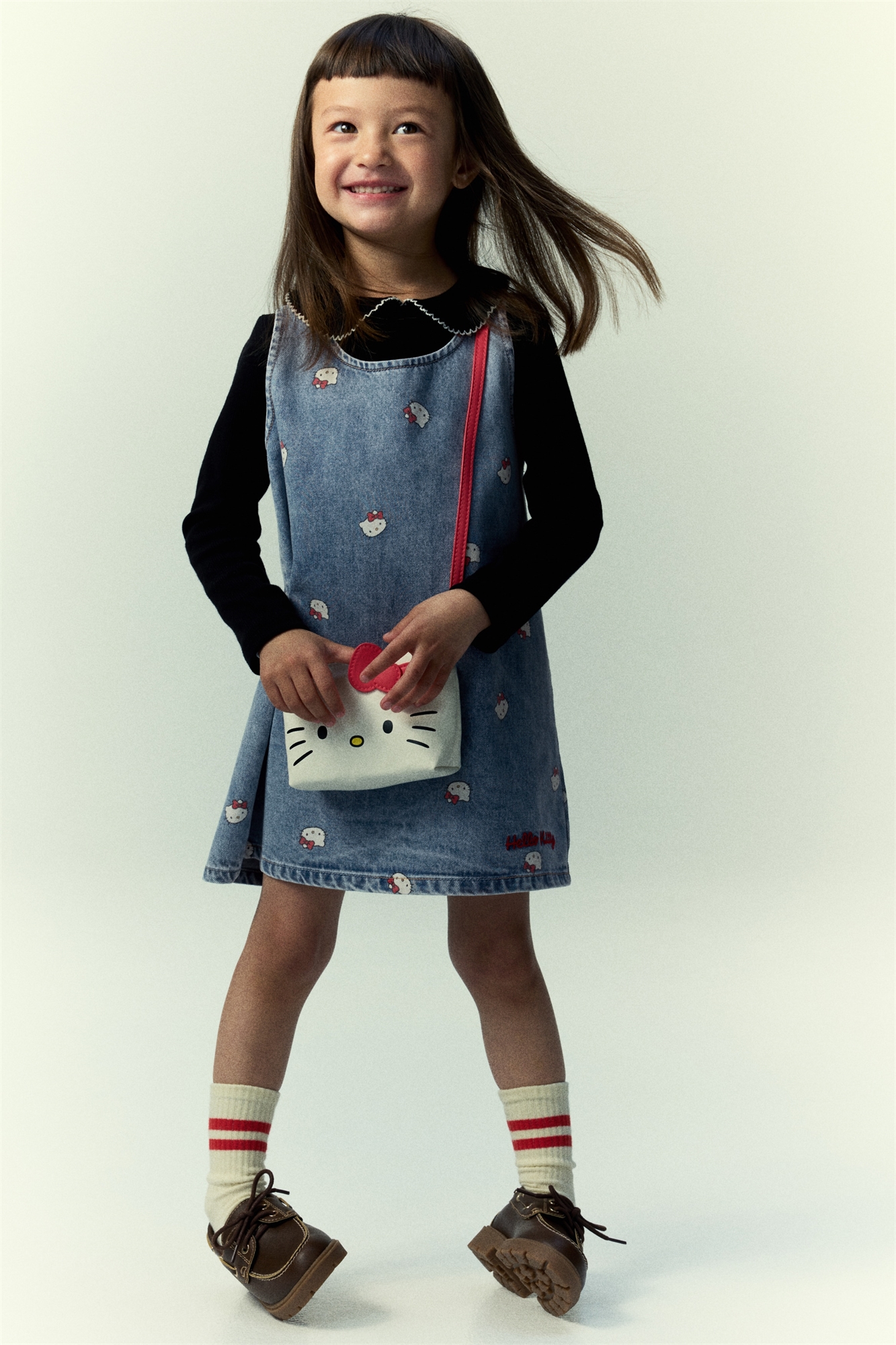 Платье А-линии без рукавов из мягкого хлопкового денима с принтом по всей поверхности. Круглый вырез и небольшая вышитая деталь на подоле.