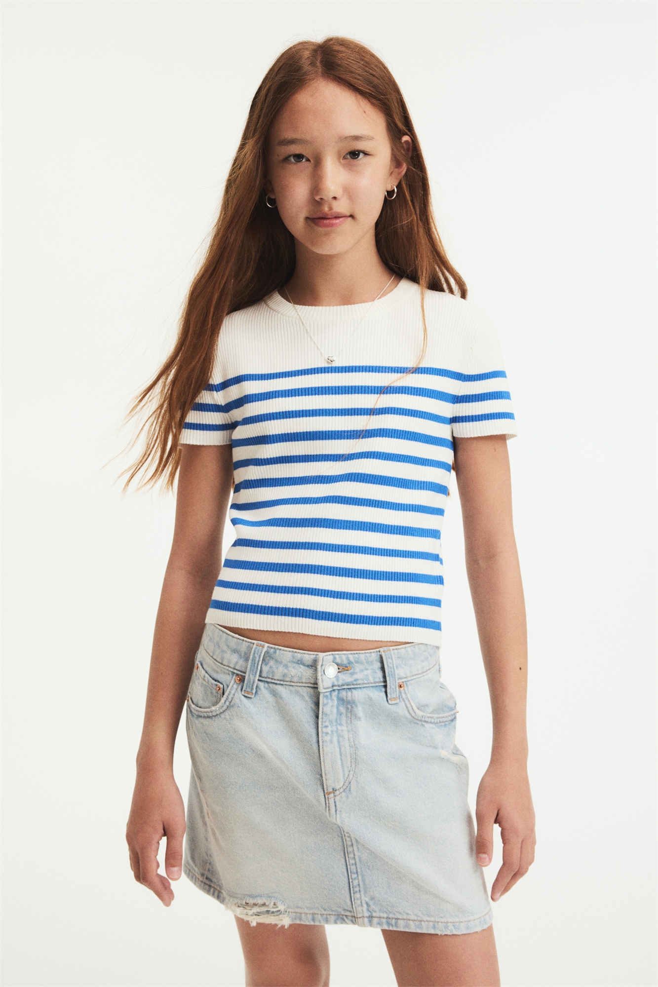 Короткий топ из мягкого трикотажа в рубчик с круглым вырезом и короткими рукавами.