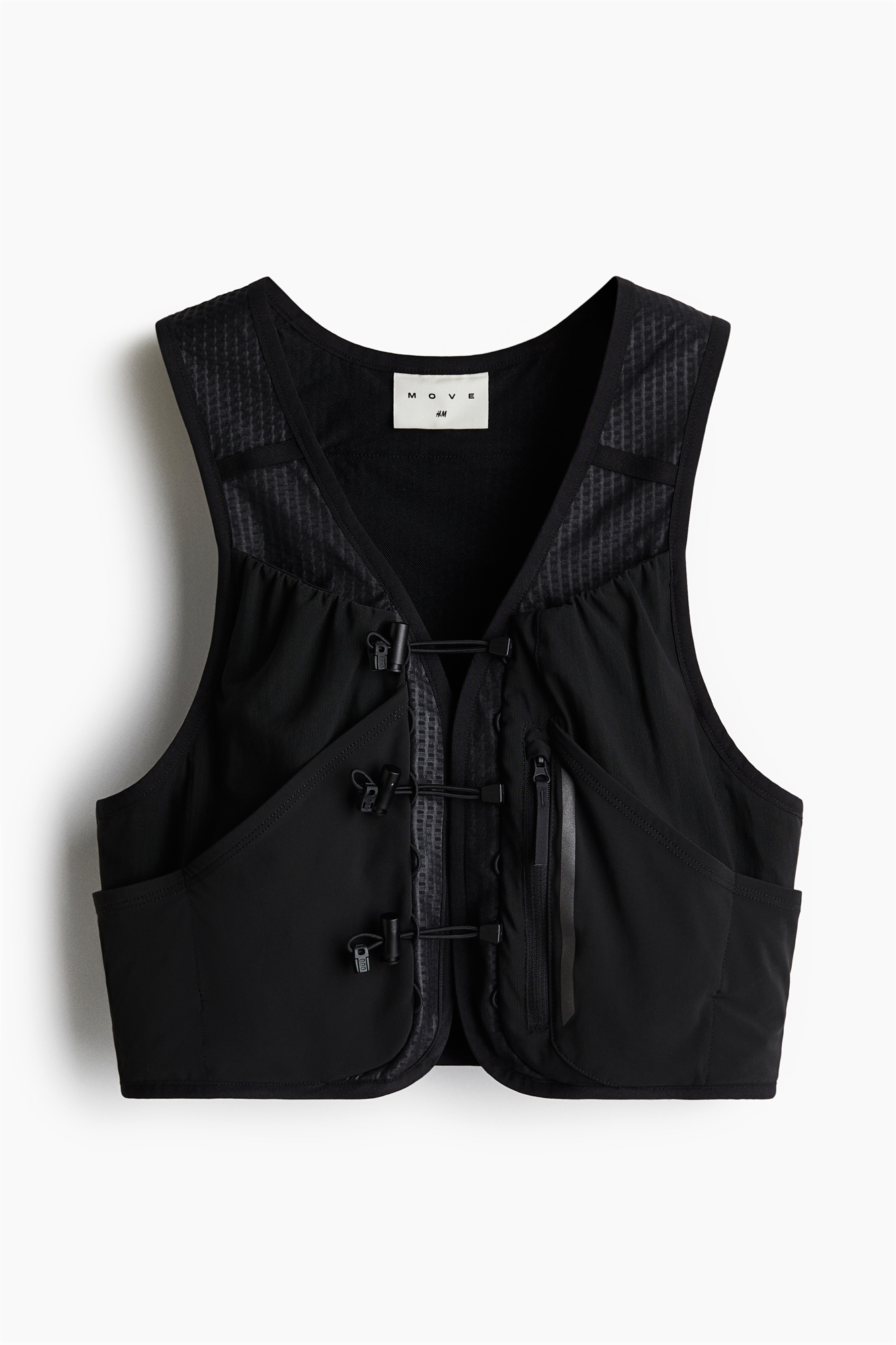 Легкий жилет для бега из дышащей сетки с ткаными панелями и регулируемыми эластичными шнурами с ограничителем спереди. Нагрудные карманы для бутылок с водой, фиксируемые эластичными ремнями, небольшие передние карманы с эластичными завязками и задний карман на молнии. Регулируемые эластичные ремни для туристических палок сзади. Светоотражающие детали. Машинная стирка в мешке для стирки.