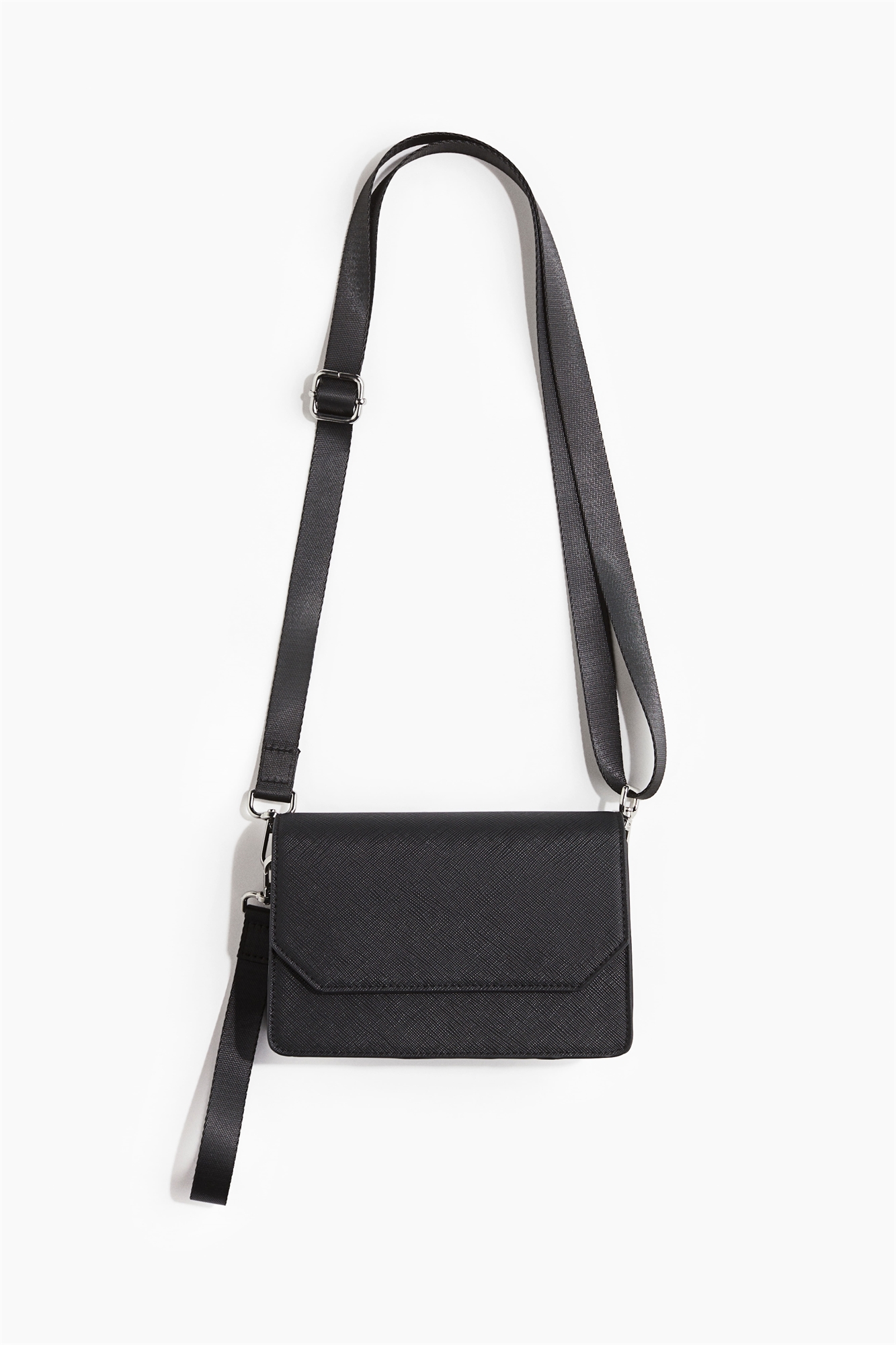 Сумка-кроссбоди из мелованной ткани с клапаном на магнитной застежке и регулируемым съемным плечевым ремнем с металлической застежкой-скобой и крючками-карабинами. Внутреннее отделение на молнии. Съемный ремешок для запястья из гросгрейн с крючком-карабином. На подкладке.