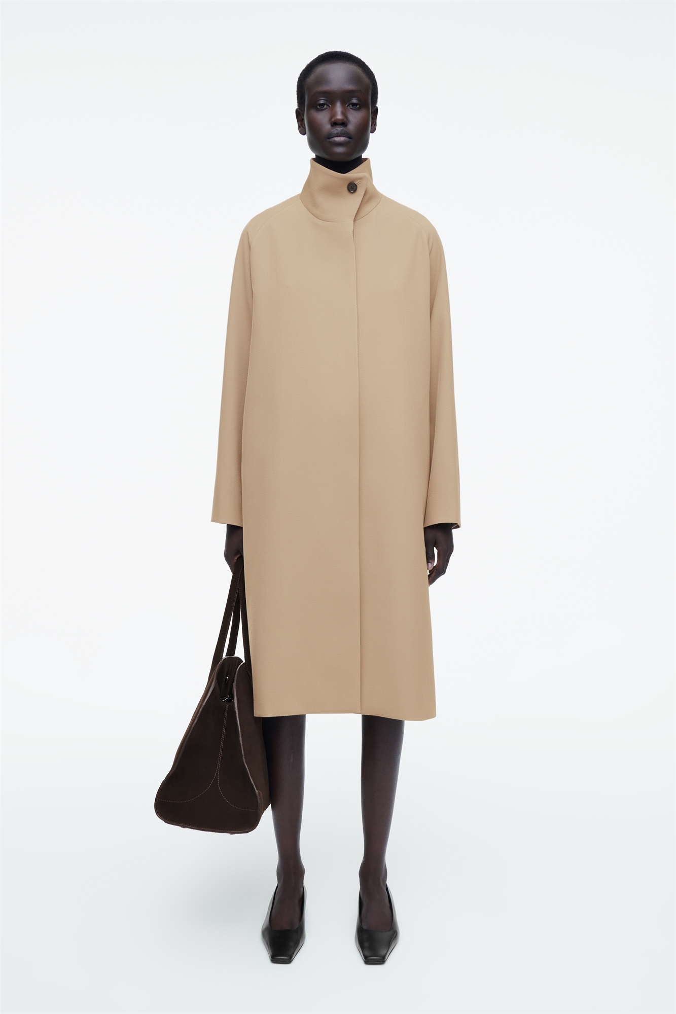 В этом сезоне команда женской одежды обратилась к классическому длинному пальто через призму направления. Выполненное в нестареющем верблюжье-бежевом цвете, оно сшито из премиальной шерстяной саржи RWS и имеет форму трапеции с едва заметным объемным подолом. Модель имеет мягко изогнутый воронкообразный вырез и тонкие рукава "летучая мышь". Свободный крой Застежка на пуговицы Карманы в боковых швах Материал: 60% шерсть RWS, 40% переработанный полиэстер. Подкладка: 100% вискоза. Без учета отделки / Сухая чистка Длина по спинке для размера EU 36 составляет 106,6 см / Модель носит размер EU 36