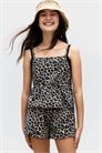 Комплект из топа на бретелях и шорт из мягкого хлопкового полотна. Топ с квадратным вырезом горловины, узкими бретелями на плечах, платочной вязкой на спине, сборчатым швом на талии и пеплумом. Шорты с эластичной талией и незаметными боковыми карманами.