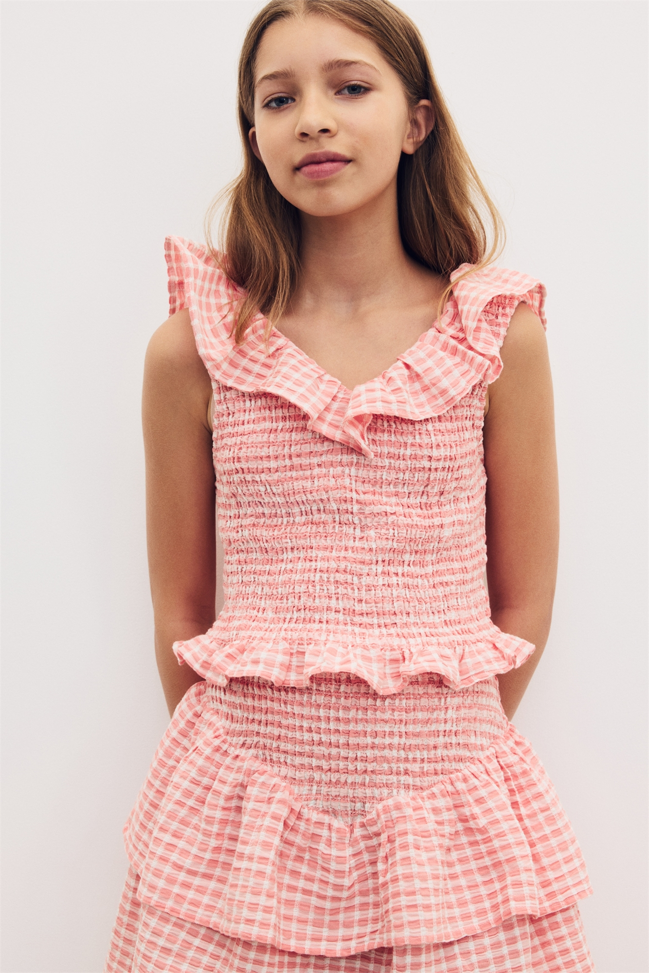 Комплект из топа и юбки из фактурного хлопкового полотна с вышивкой. Топ без рукавов с V-образным вырезом горловины с оборкой, переходящей на плечи, и подолом с оборкой. Юбка с V-образным вырезом с оборкой в верхней части.