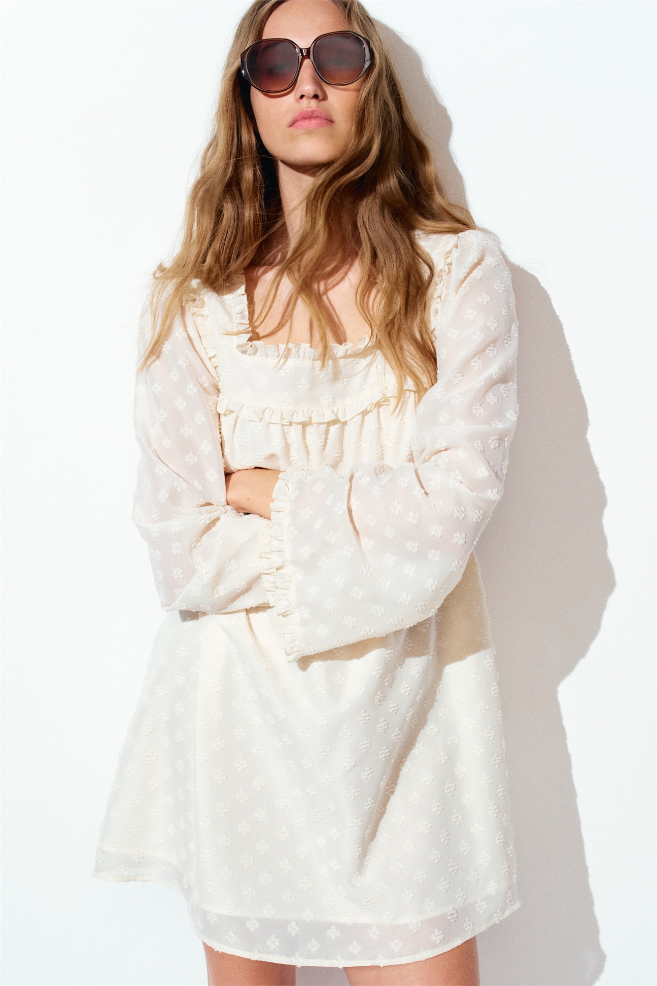 Короткое платье свободного покроя из плотного плетения плюмети с квадратным вырезом и сборками спереди и сзади. Длинные рукава и отделка оборками спереди и на манжетах. Частично на подкладке.