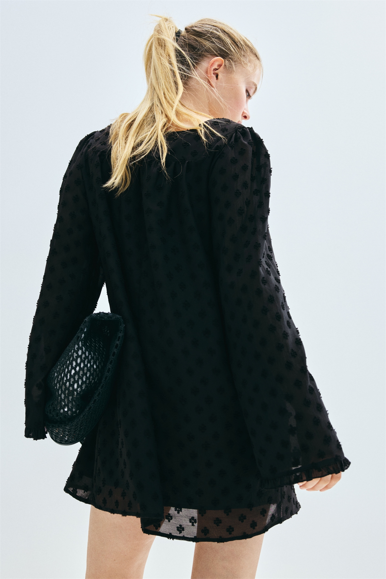 Короткое платье свободного покроя из плотного плетения плюмети с квадратным вырезом и сборками спереди и сзади. Длинные рукава и отделка оборками спереди и на манжетах. Частично на подкладке.