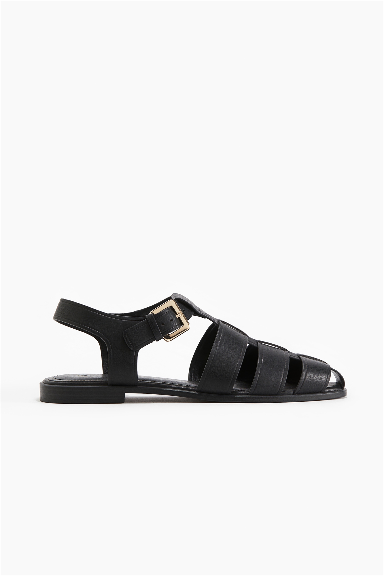 Сандалии Fisherman из ткани с покрытием, закрытый носок с переплетенными ремешками. Миндалевидные пальцы и регулируемый ремешок на щиколотке с металлической пряжкой.