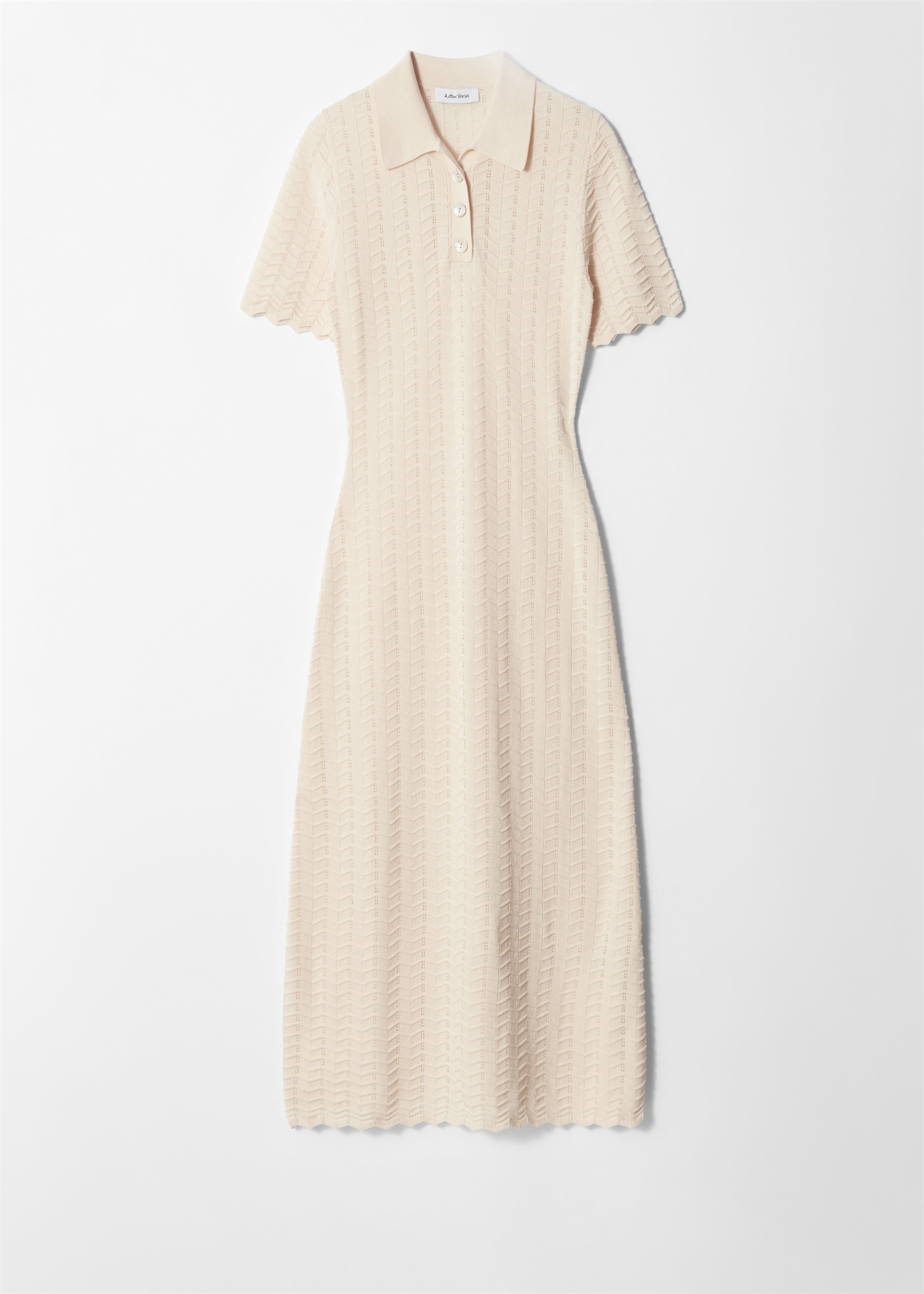 Это платье-миди сшито из мягкой, эластичной хлопковой ткани с открытым пуантельевым узором. Приталенный силуэт, классический воротник, застежка на пуговицах спереди и короткие рукава. Отделка декоративными гребешками по краям. Длина платья: 123 см / 48,4 (размер S)