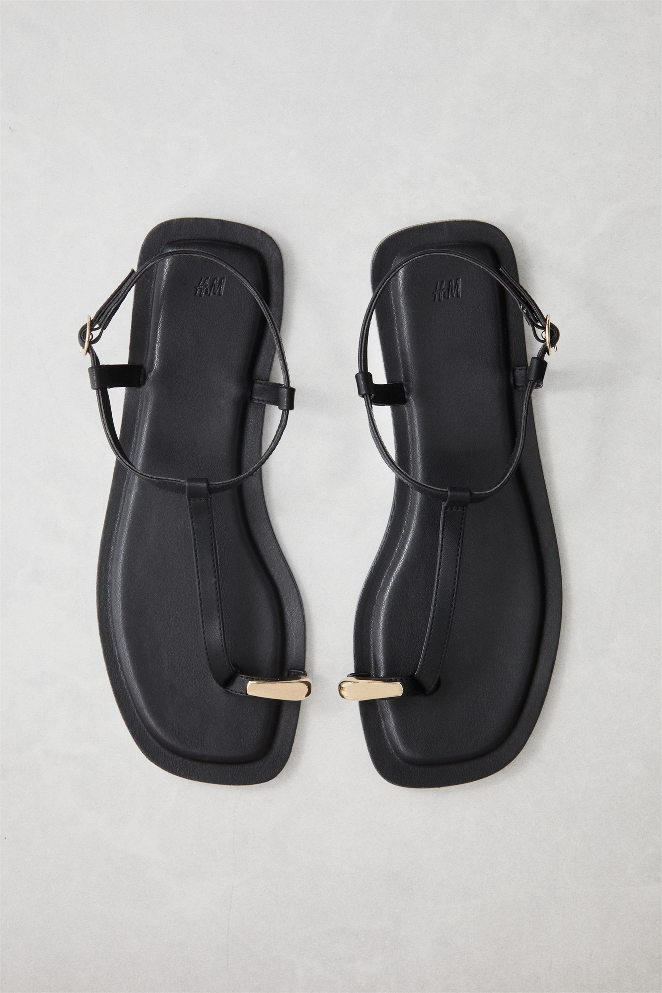 Сандалии из мелованной ткани с Т-образным ремешком и петлей на носке, украшенной металлической деталью. Регулируемый ремешок на щиколотке с круглой металлической пряжкой.