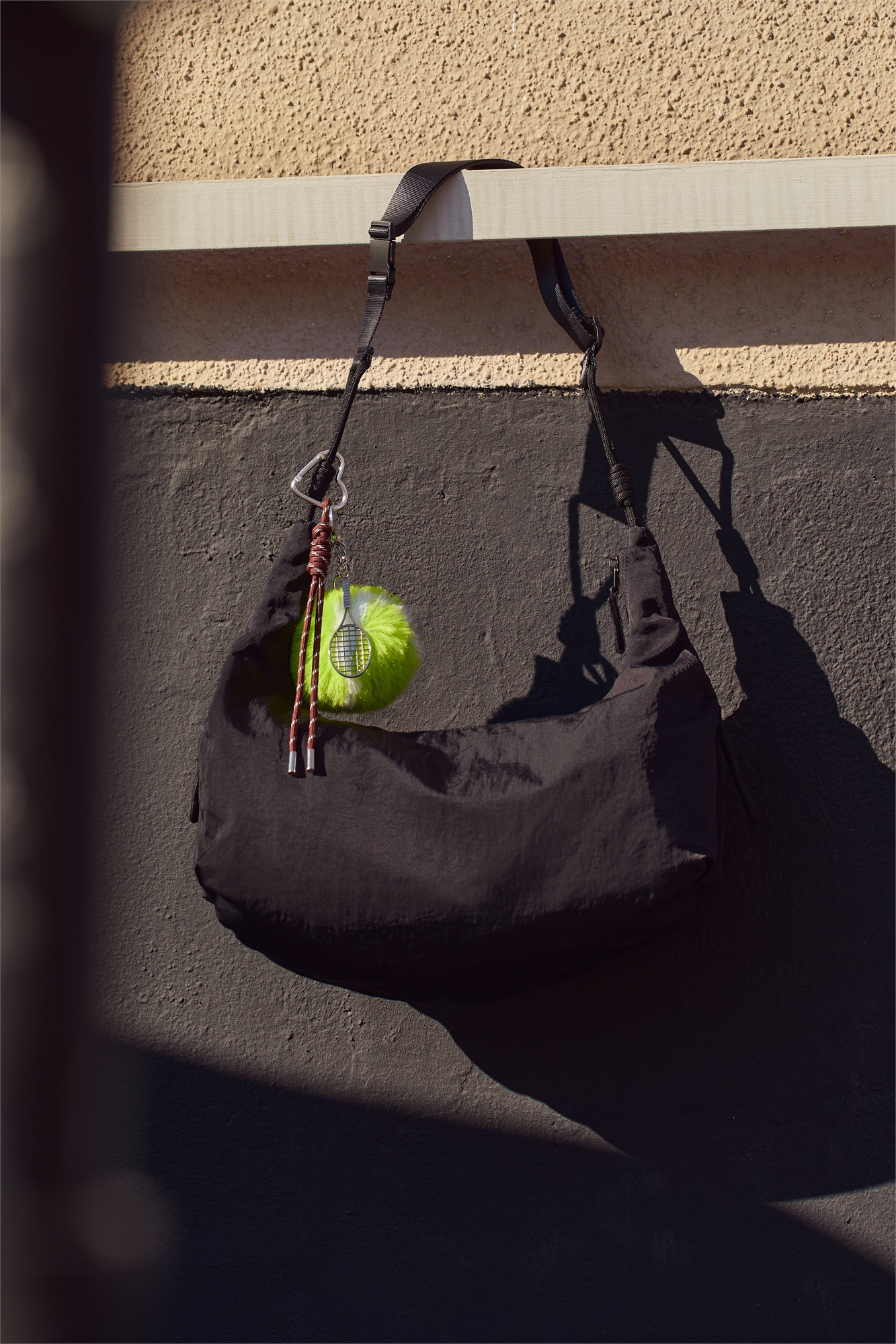 Спортивная сумка из нейлона с регулируемым плечевым ремнем, украшенным акцентами из шнура на обоих концах и пластиковой застежкой-защелкой. Застежка-молния сверху и эластичный шнурок с ограничителями на каждой стороне. Одно большое отделение и маленькое внутреннее отделение на молнии. На подкладке.