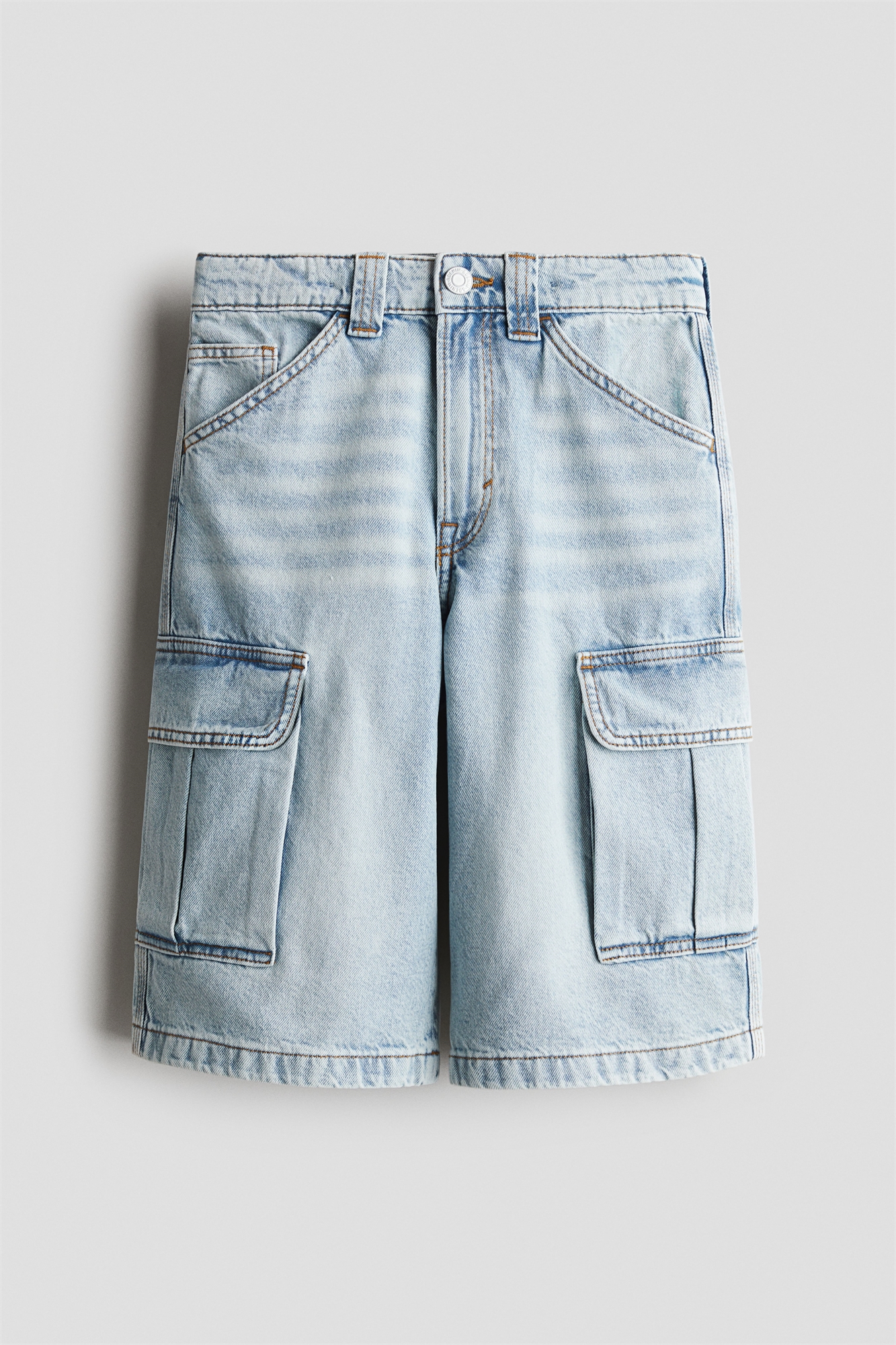 Шорты длиной до колена из хлопкового денима. Мешковатый крой с регулируемой эластичной талией и ширинкой на молнии с пуговицей. Передние карманы, накладные карманы на ногах и открытые задние карманы.