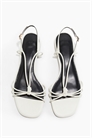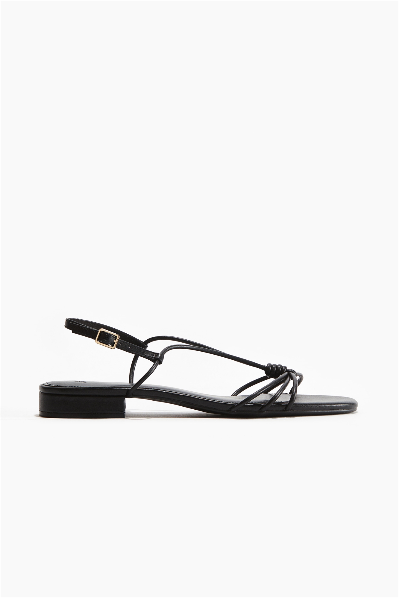 Сандалии на бретельках из лакированной ткани с квадратным носком и ремешками-спагетти с узлом спереди. Узкий регулируемый ремешок на пятке с квадратной металлической пряжкой.