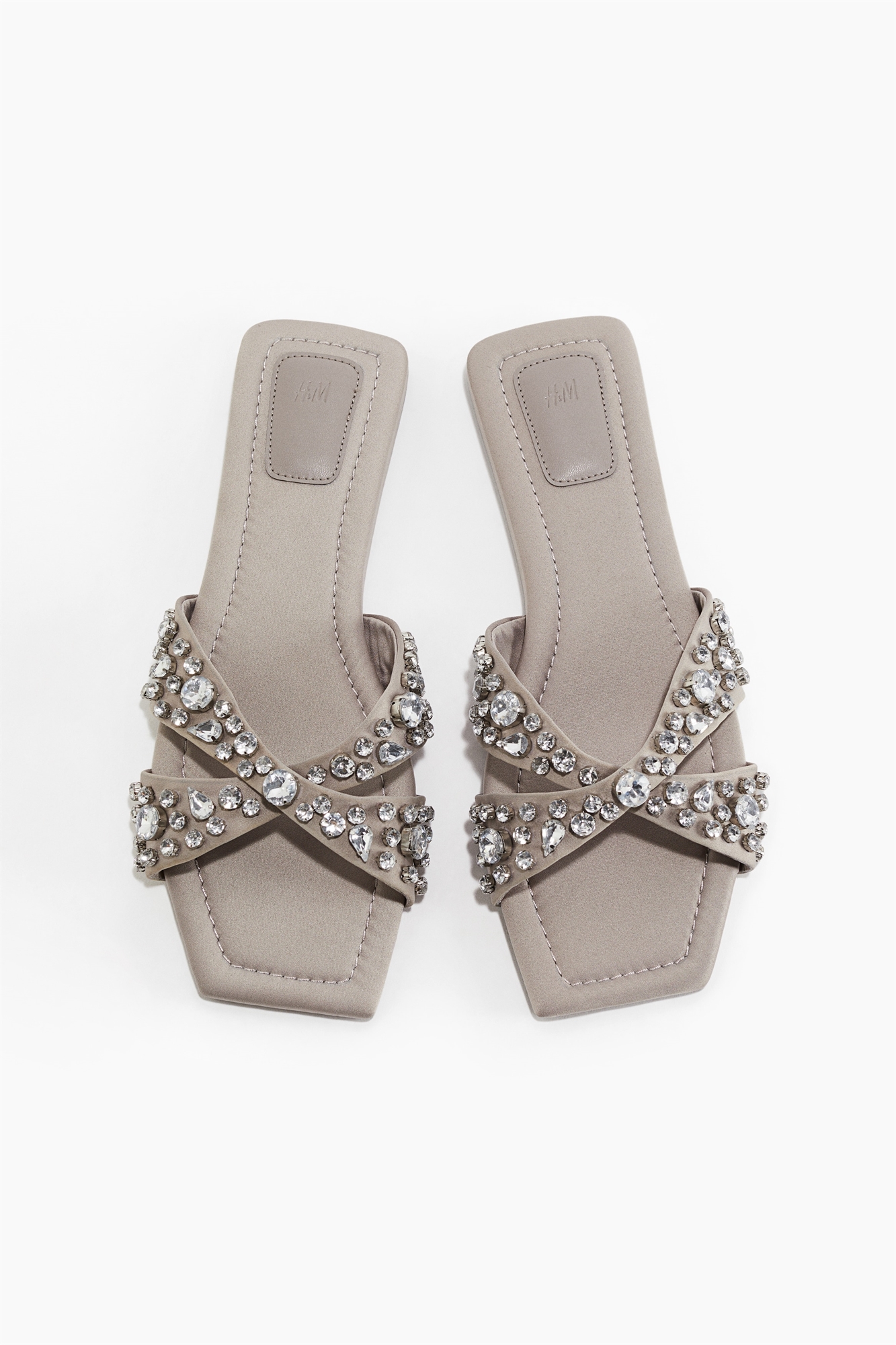 Сандалии из атласа с квадратным носком и перекрещивающимися ремешками на ноге, украшенными сверкающими стразами.