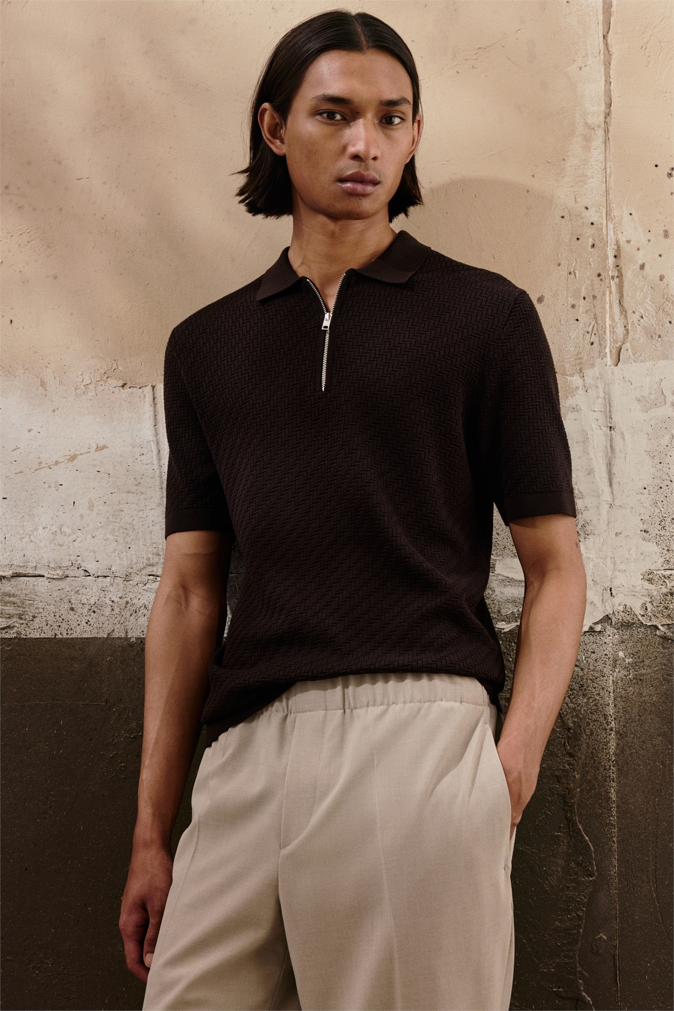 Рубашка-поло с короткими рукавами из тонкого трикотажа из смеси хлопка с ребристым воротником, застежкой-молнией в верхней части и тонкой тесьмой на манжетах и подоле. Зауженный крой, облегающий контуры тела и создающий приталенный силуэт.