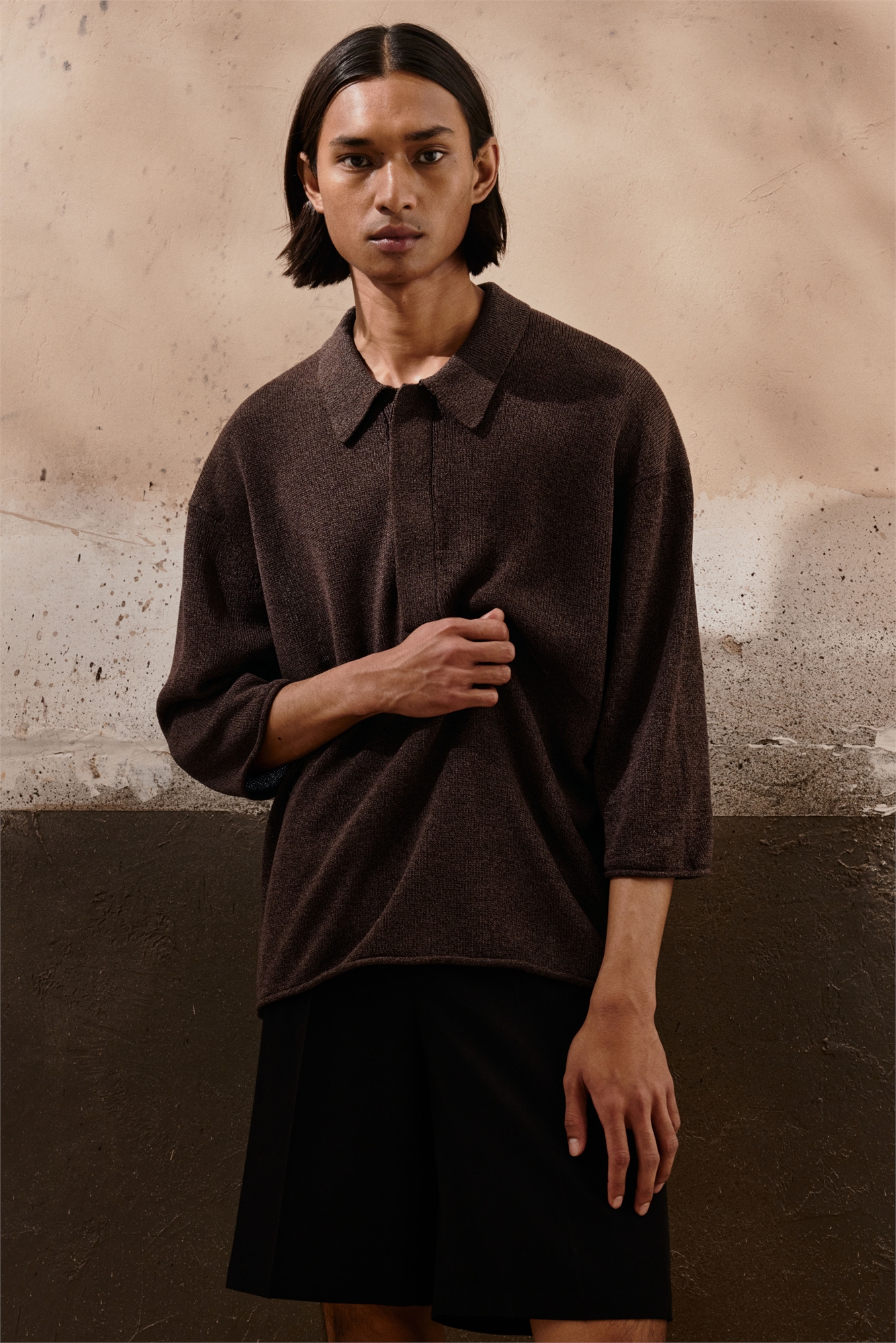 Рубашка-поло из тонкого трикотажа с отложным воротником, потайной застежкой на пуговицах, спущенными плечами, рукавами три четверти и прямым подолом. Свободный крой для объемного, но не чрезмерно большого силуэта.