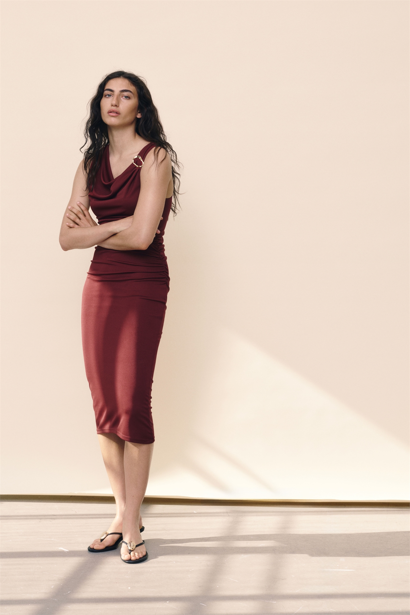 Платье из джерси длиной до колен, без рукавов, с вырезом-лодочкой и широкими бретелями, одна из которых с асимметричной металлической деталью. Сборки по бокам на талии и на одном плече создают эффект драпировки.