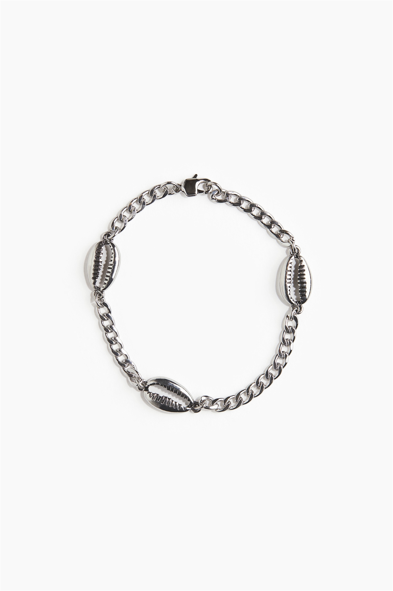 Металлический браслет-цепочка, украшенный ракушками из металла, с застежкой-триггером.
