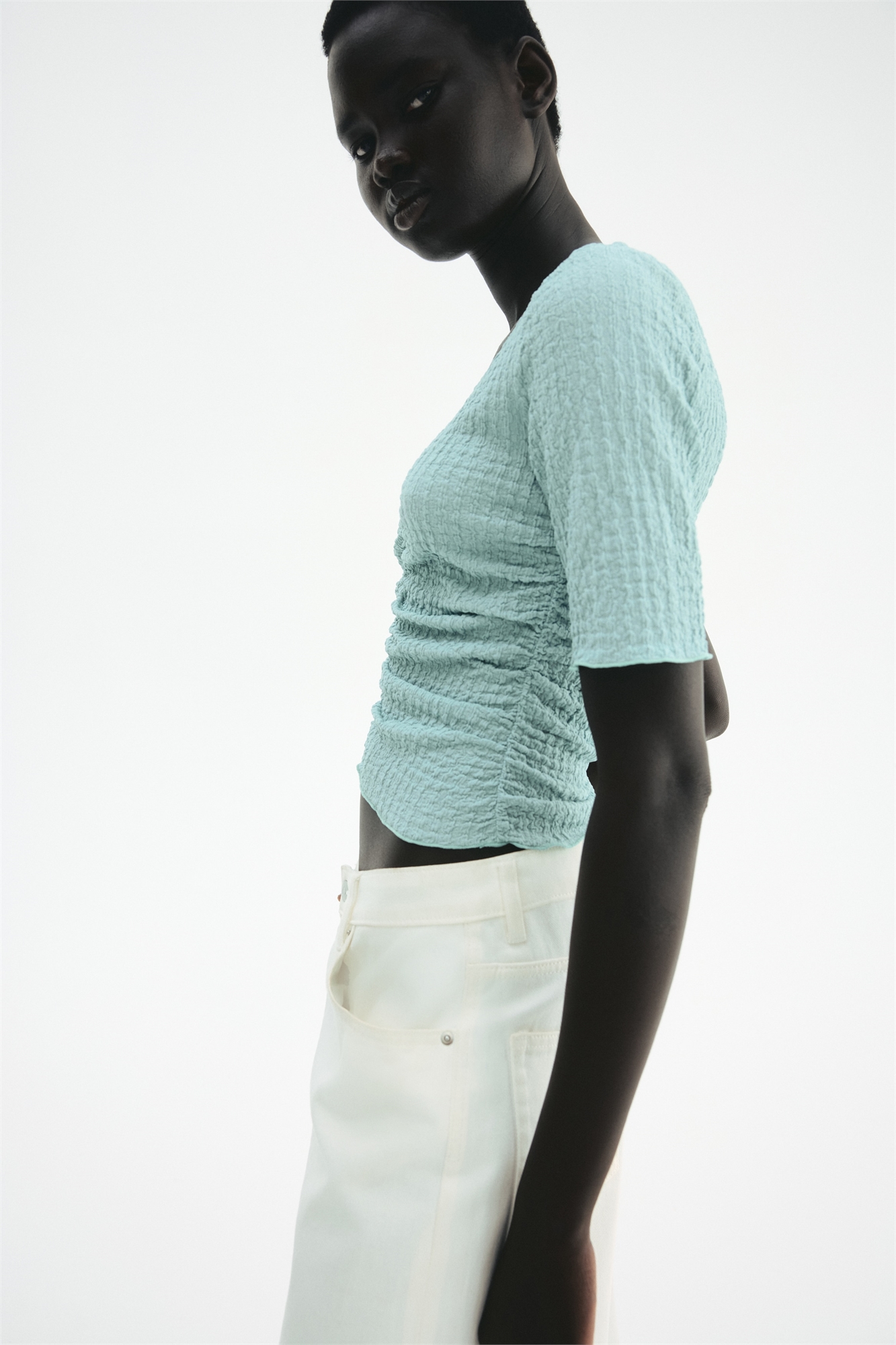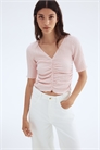 Облегающий топ из фактурного джерси с V-образным вырезом горловины и сборками по переду и бокам для создания эффекта драпировки. Манжеты и подол обработаны оверлоком.