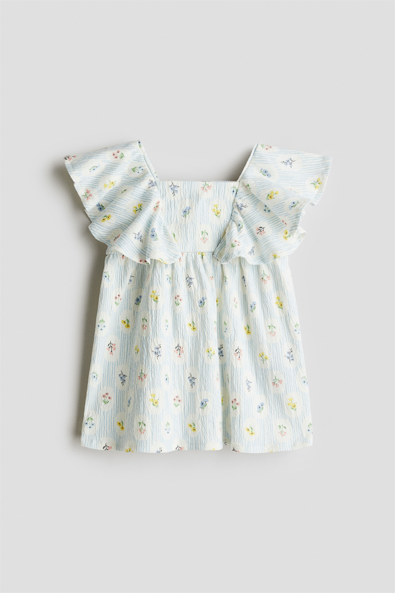 Платье из мягкого хлопкового трикотажа с принтом на всю длину. Квадратный вырез горловины и узкий вырез с воланами спереди, переходящими на плечи. Сборки в верхней части и расклешенная юбка.