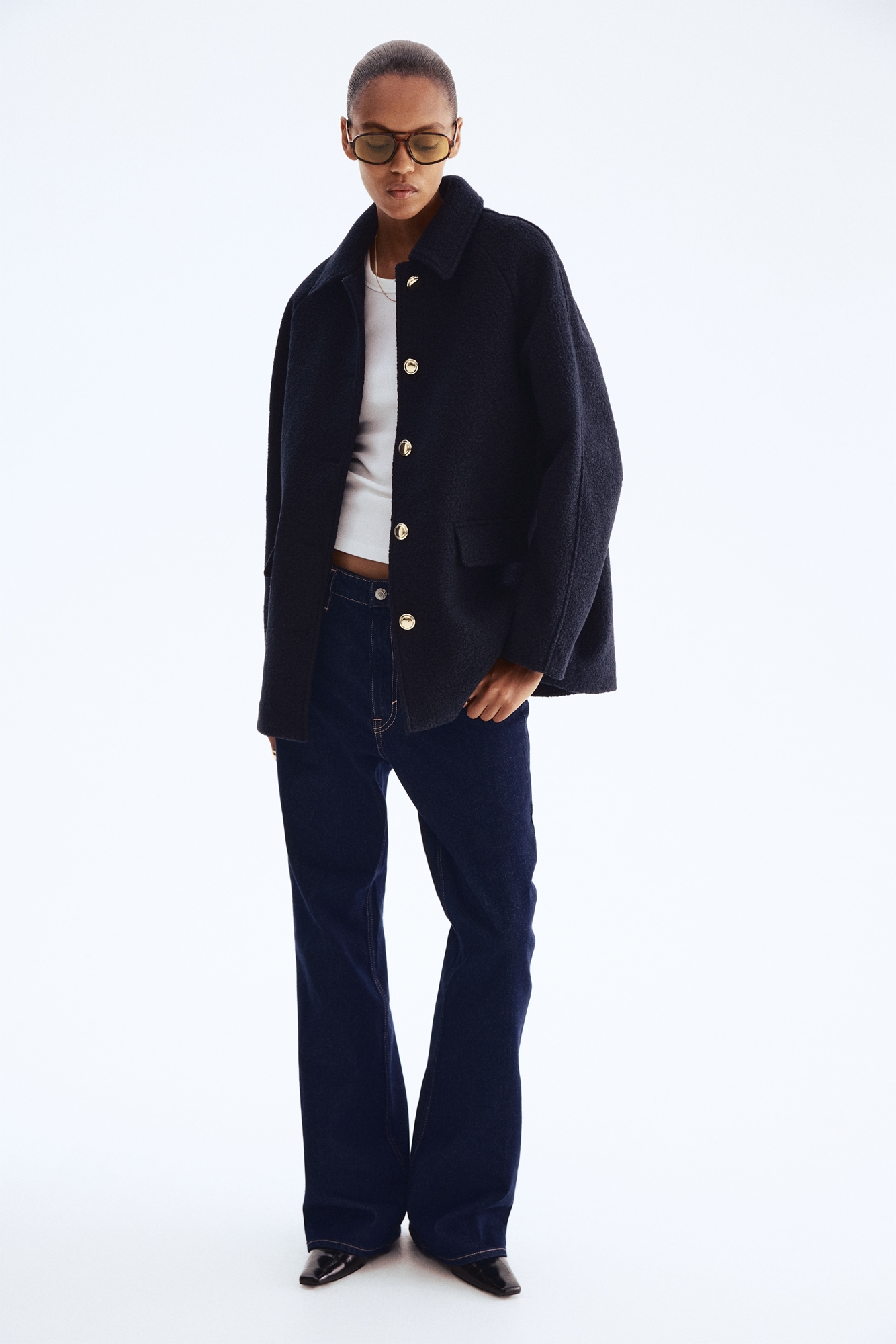 Пальто а-линии из войлока с воротником и пуговицами спереди. Длинные рукава реглан и накладные передние карманы. На подкладке.