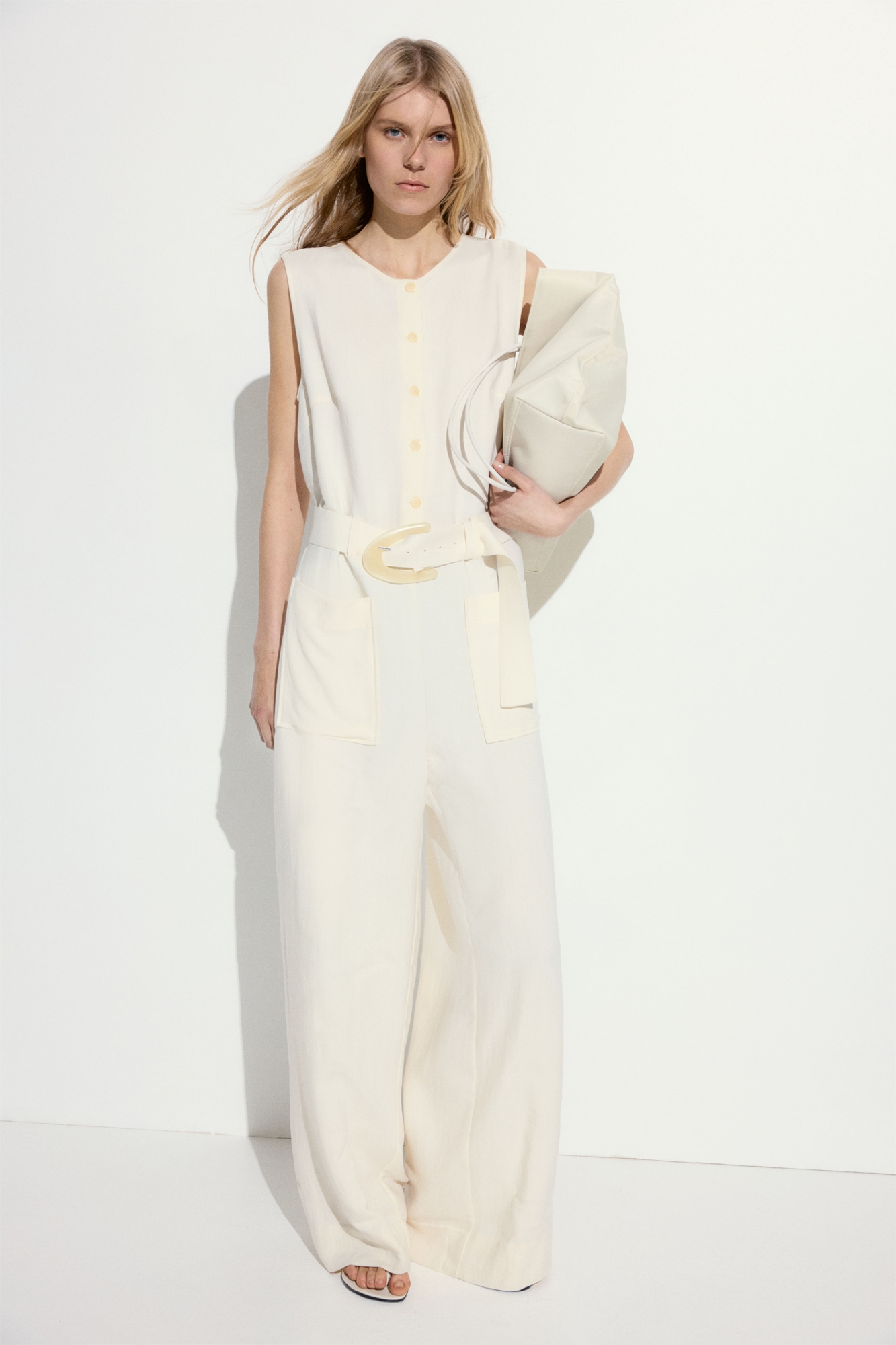 Джемпер без рукавов из тканого материала с круглым вырезом, пуговицами спереди и широким съемным поясом на талии. Эластичный шов сзади на талии и прямые ноги с накладными карманами спереди.